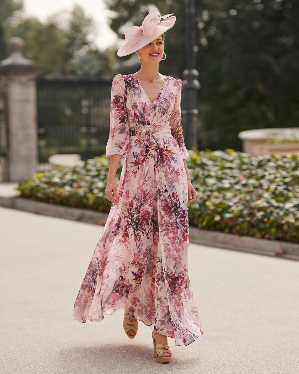 Vestido de fiesta largo y estilo fluido. Confeccionado en georgette estampado. Con escote v y manga abullonada.Modelo Couture Club.