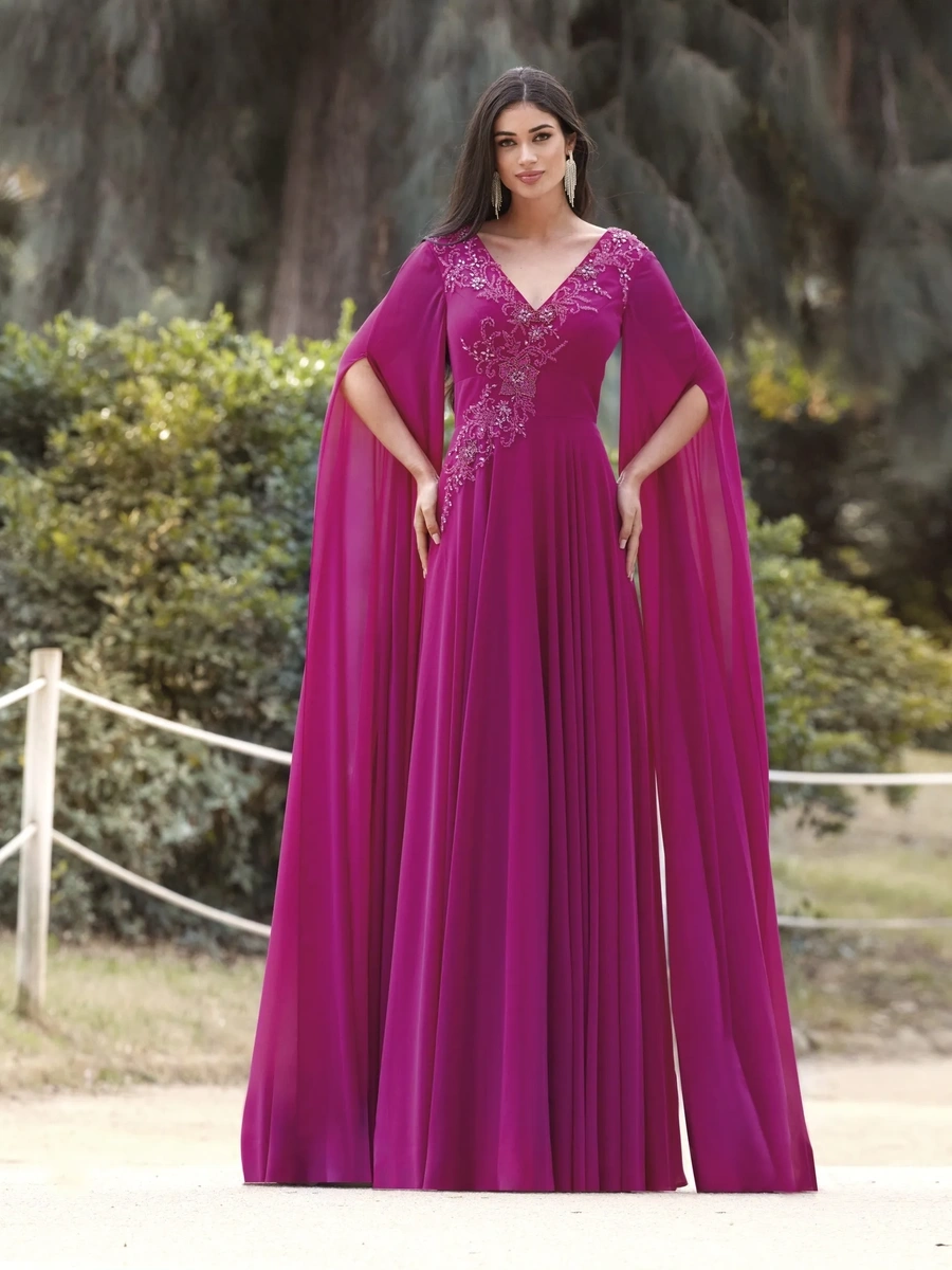 Está realizado en gasa de color buganvilla y aplicaciones de encaje y pedrería. Destacan sus mangas a modo de capa, por lo que lo hace un modelo muy elegante para madrinas y madres del novio/a.