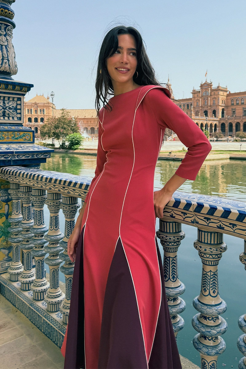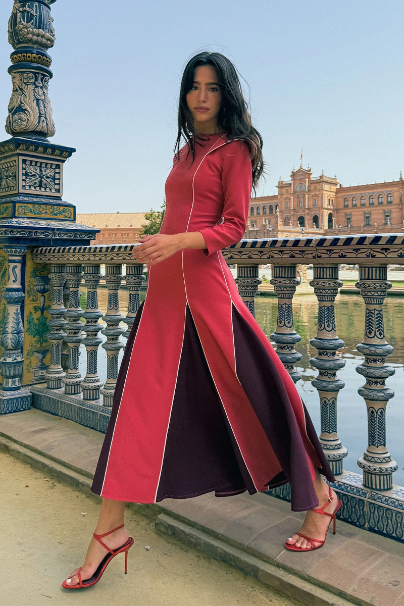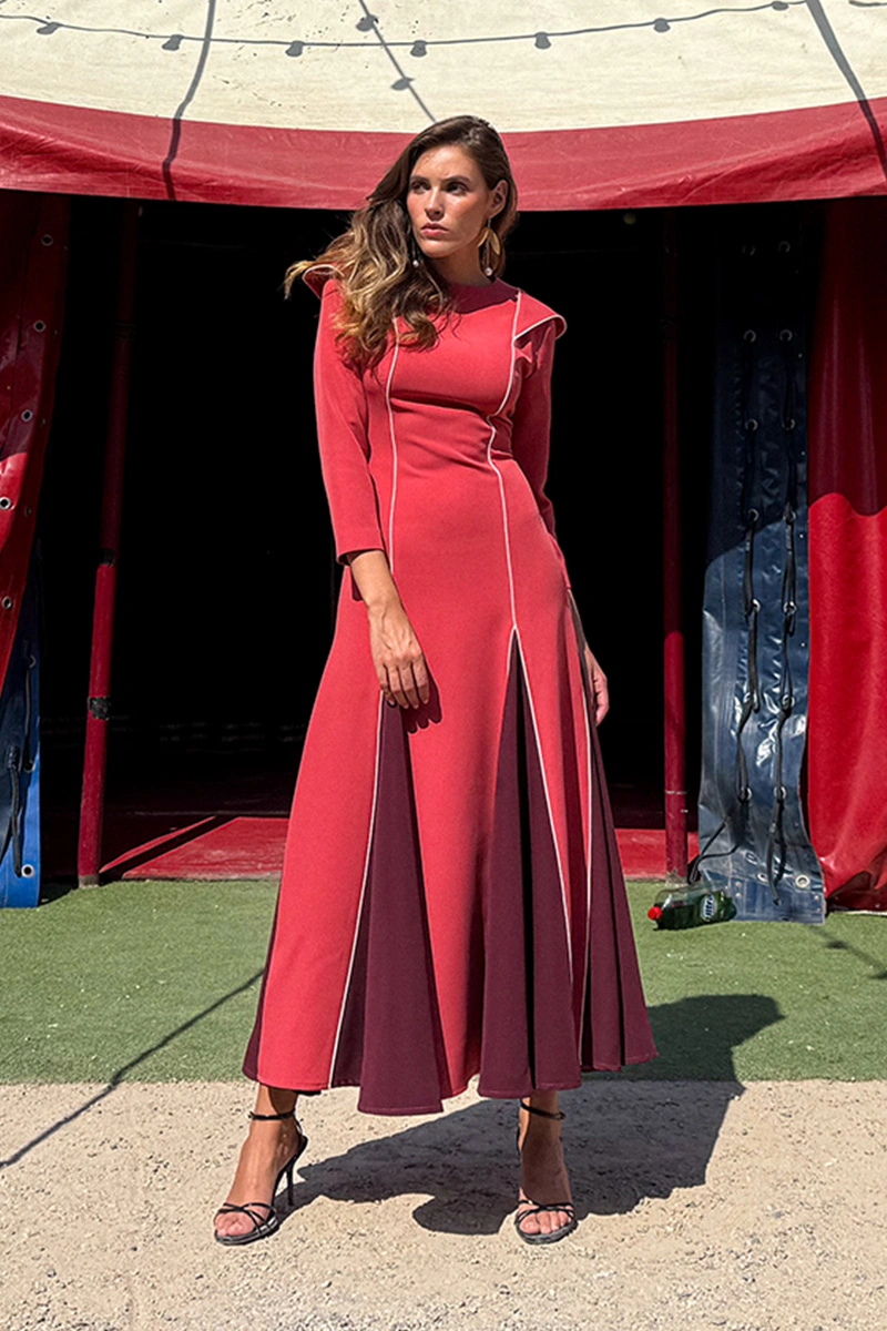 Vestido de largo midi con manga francesa, cuello a la caja, detalle de mini alerones en hombros y godets a contraste en falda.