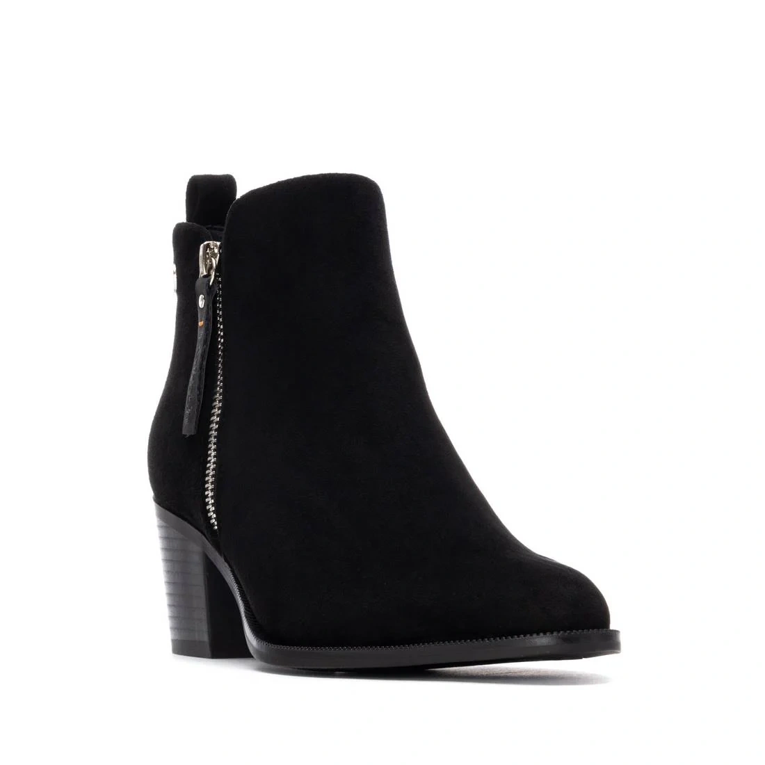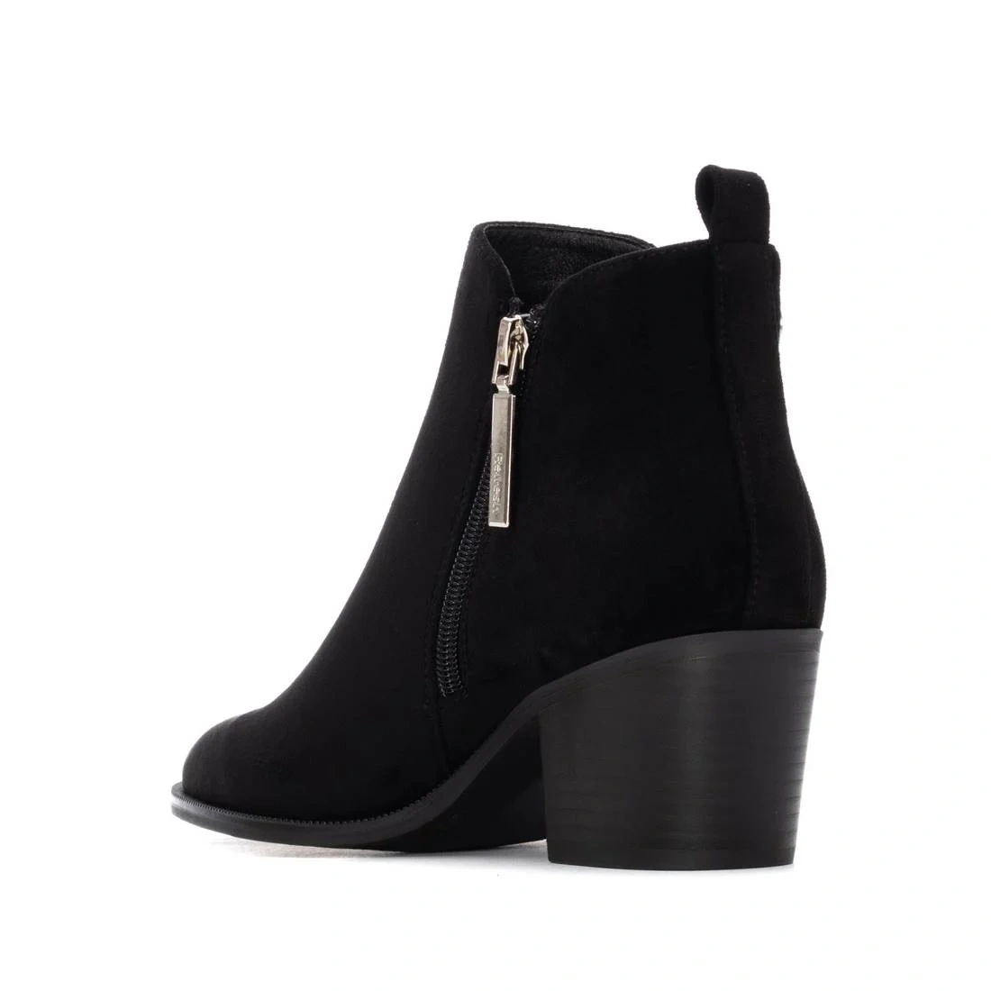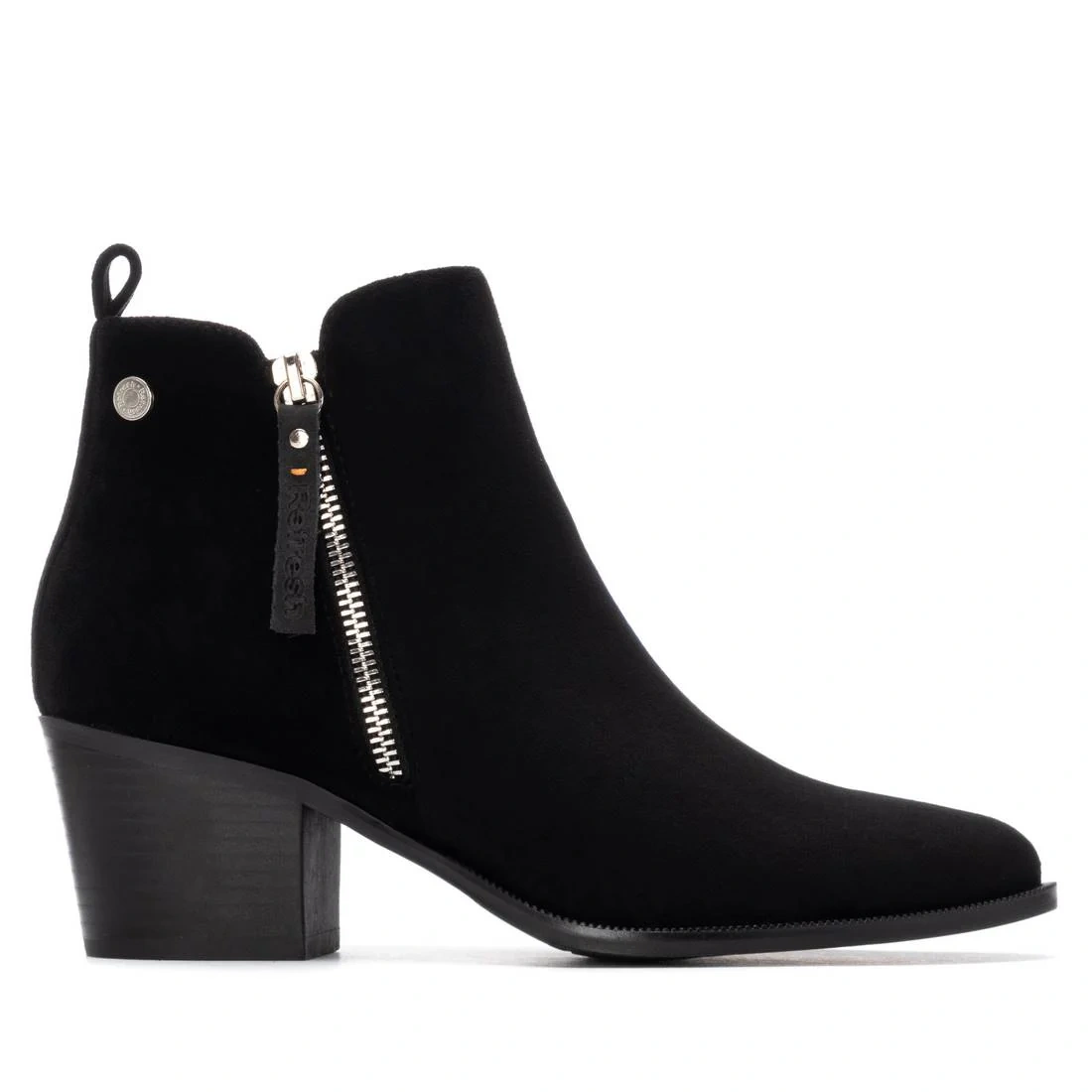Botín de mujer, de la marca Refresh. Fabricado en suave antelina. Cremalleras laterales, exterior decorativa, interior con función. Tirador trasero para facilitar la puesta. Este modelo ha obtenido el certificado vegano por la organización mundial PETA (Organización de los derechos de los animales).