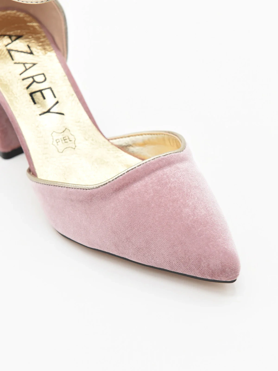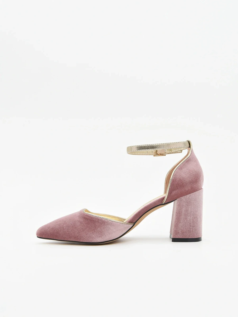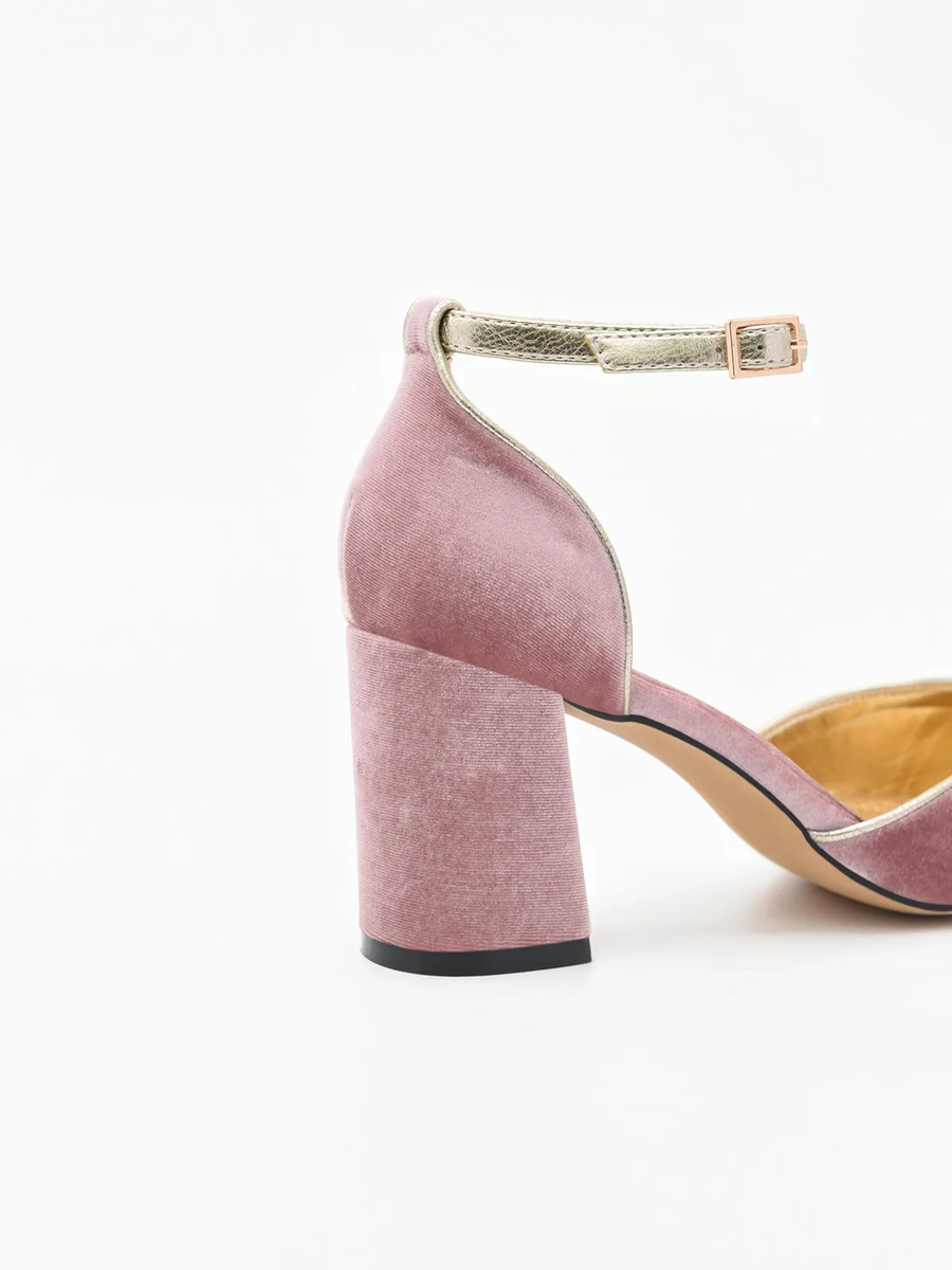 Las sandalias terciopelo rosa doradas combinan la suavidad del terciopelo rosa con el refinamiento clásico del dorado. Están diseñadas para brindar comodidad excepcional gracias a su planta de piel acolchada, mientras que el tacón ancho en dorado añade estabilidad sin sacrificar elegancia. Su cierre al tobillo aporta sujeción, permitiéndote lucirlas con gracia desde un evento especial hasta un plan relajado.