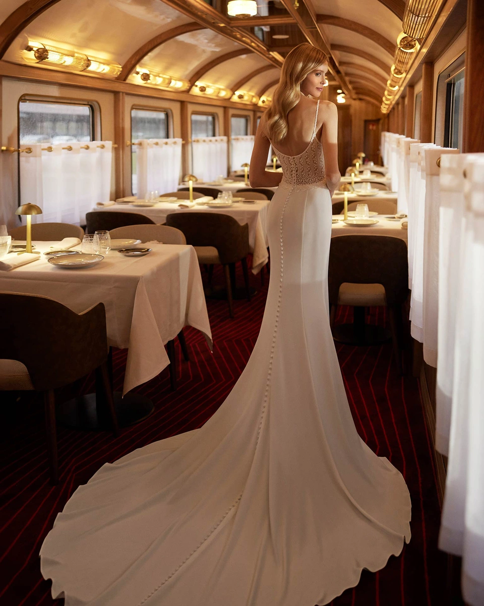 Vestido de novia largo con capa con silueta sirena y estilo sexy, elaborado en crepé con encaje pedreria. Se completa con un escote cuadrado, una espalda abierta y tirantes.