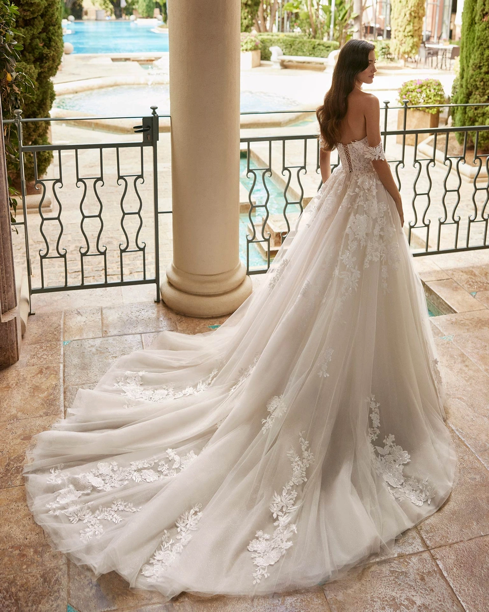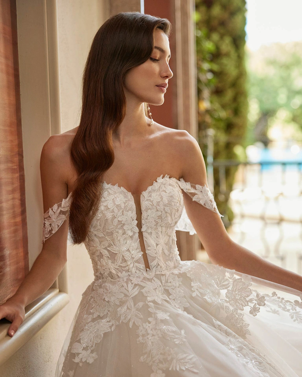 Vestido de novia largo, de corte princesa y estilo romántico, confeccionado en encaje y falda en tul. Se completa con un escote profundo, espalda corset y tirantes caídos.