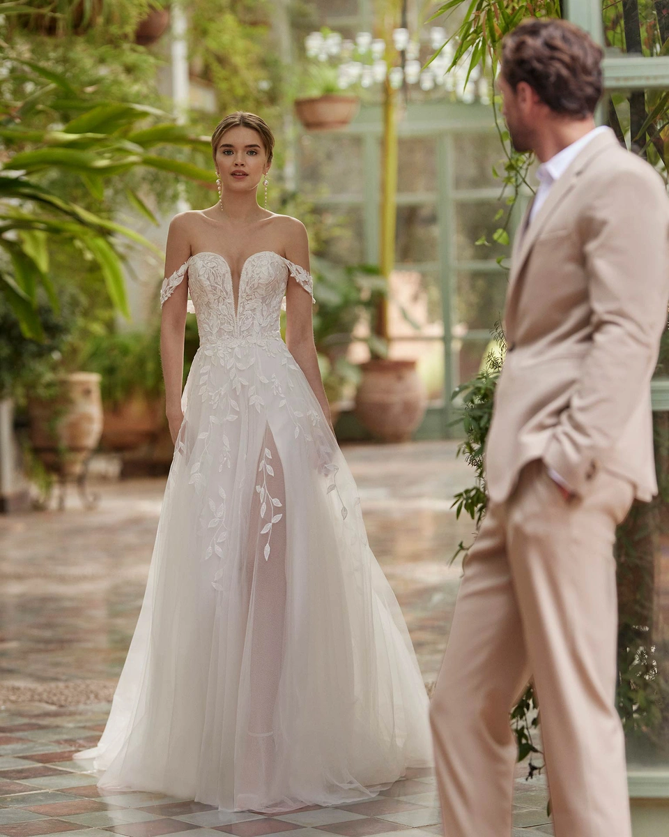 Vestido de novia línea A y estilo romántico, confeccionado en encaje y con falda en tul. Presenta un escote corazón, espalda abotonada, tirantes extraíbles y falda con abertura lateral. Modelo de ensueño Alma Novia.
