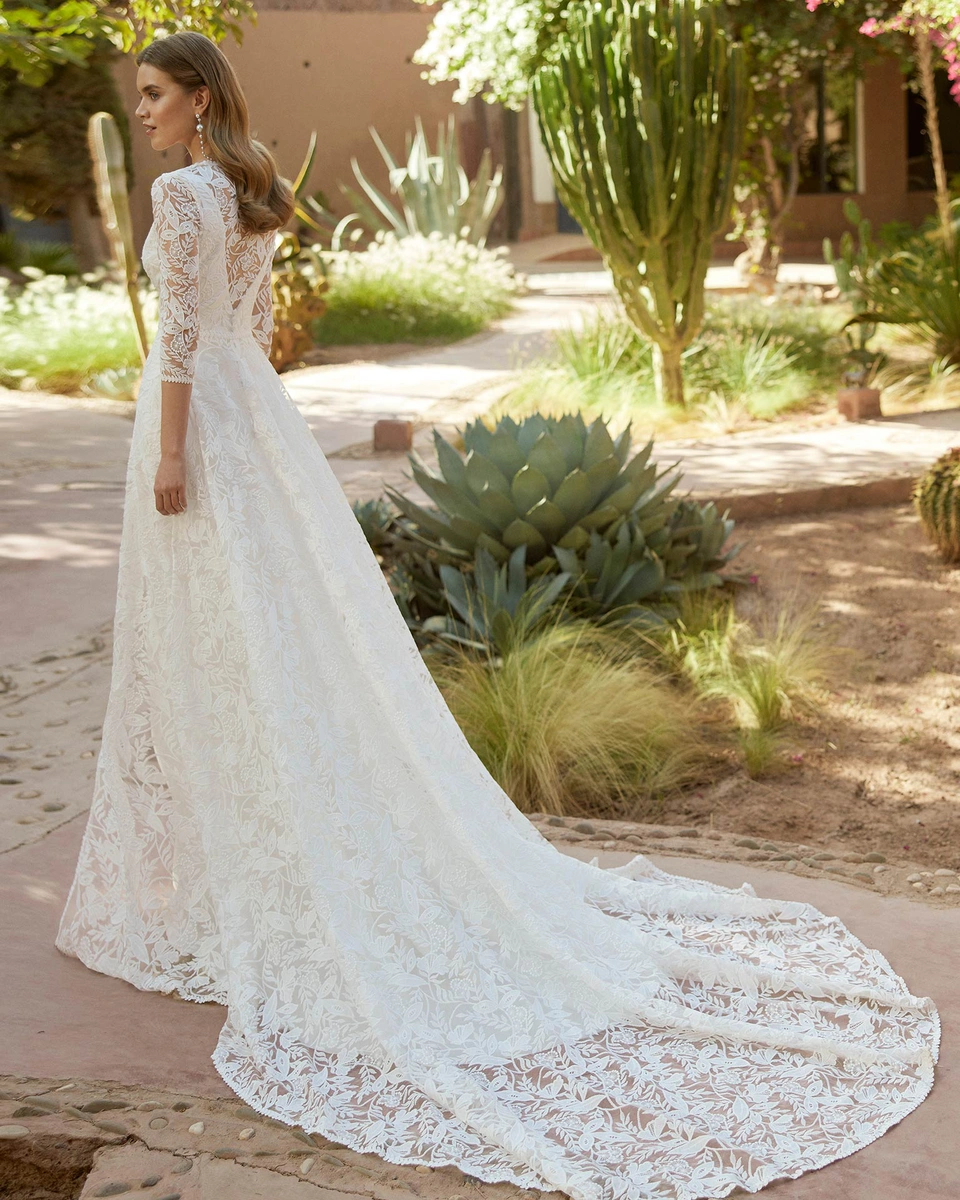 Vestido de novia de dos piezas, de corte recto y estilo romántico, realizado en crepé. Su escote de pico y la espalda en V combinan de maravilla con el abrigo de encaje. Es un modelo de ensueño Alma Novia.