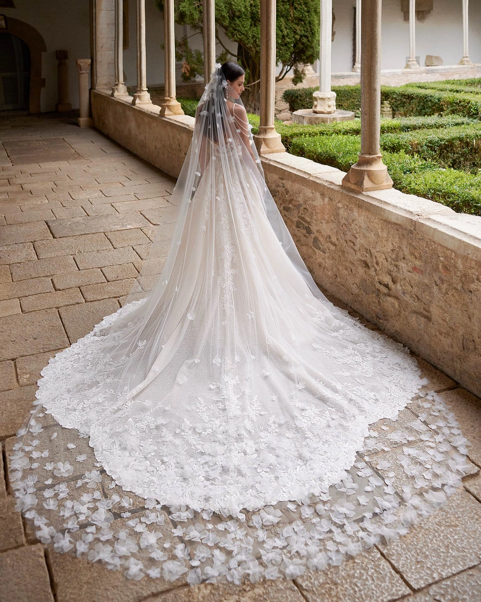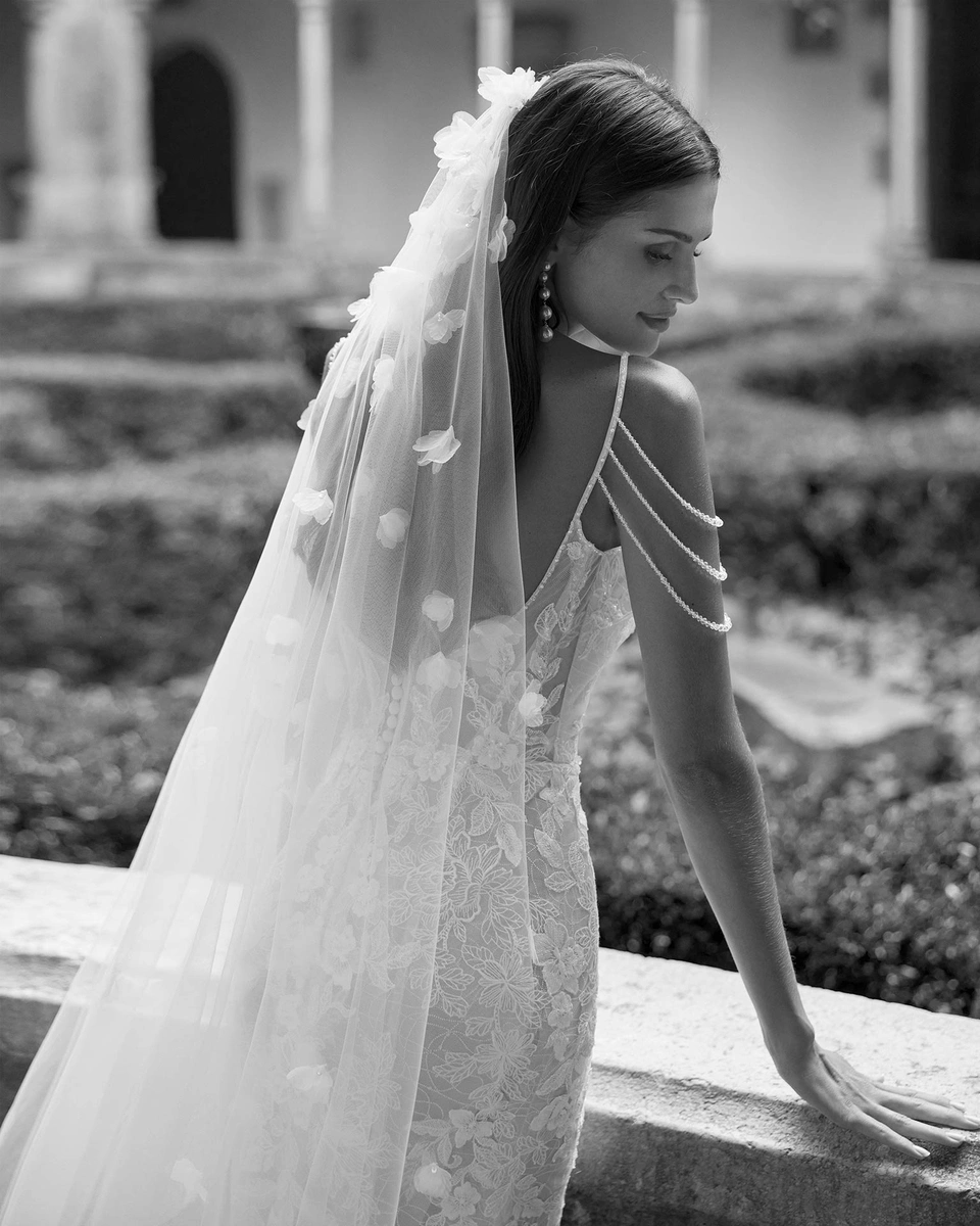 Vestido de novia de dos piezas largo, de corte sirena y estilo romántico. Confeccionado en encaje pedrería. Con escote v, espalda escotada, tirantes de pedrería y Sobrefalda extraíble. Conjunto Luna Studio de ensueño.