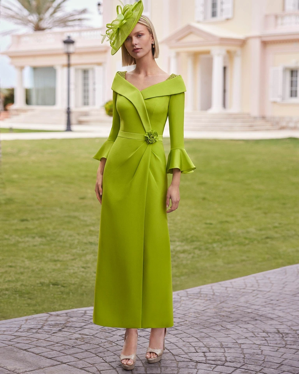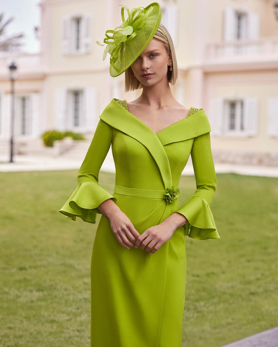 Vestido de fiesta midi. Confeccionado en crepé. Con escote pico, espalda cerrada y manga francesa con volantes. Falda con abertura trasera y Flor de adorno. Conjunto Couture Club.
