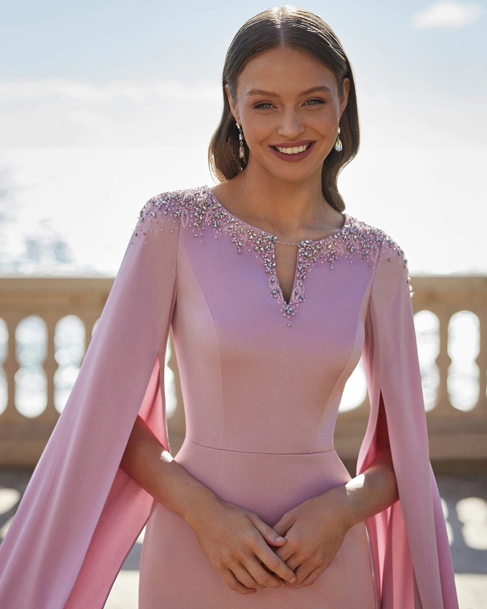 Vestido de fiesta largo. Confeccionado en crepé combinado con pedrería. Con escote caja, espalda cremallera y manga capa. Conjunto Couture Club.