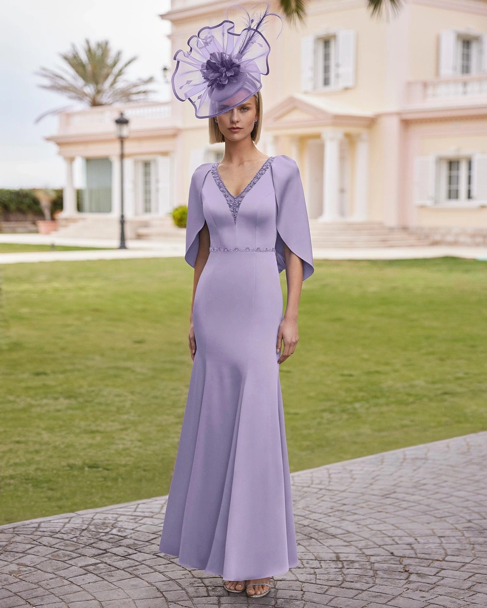 Vestido de fiesta midi. Confeccionado en crepé. Con escote v, espalda cerrada, manga capa y pedrería. Conjunto Couture Club.