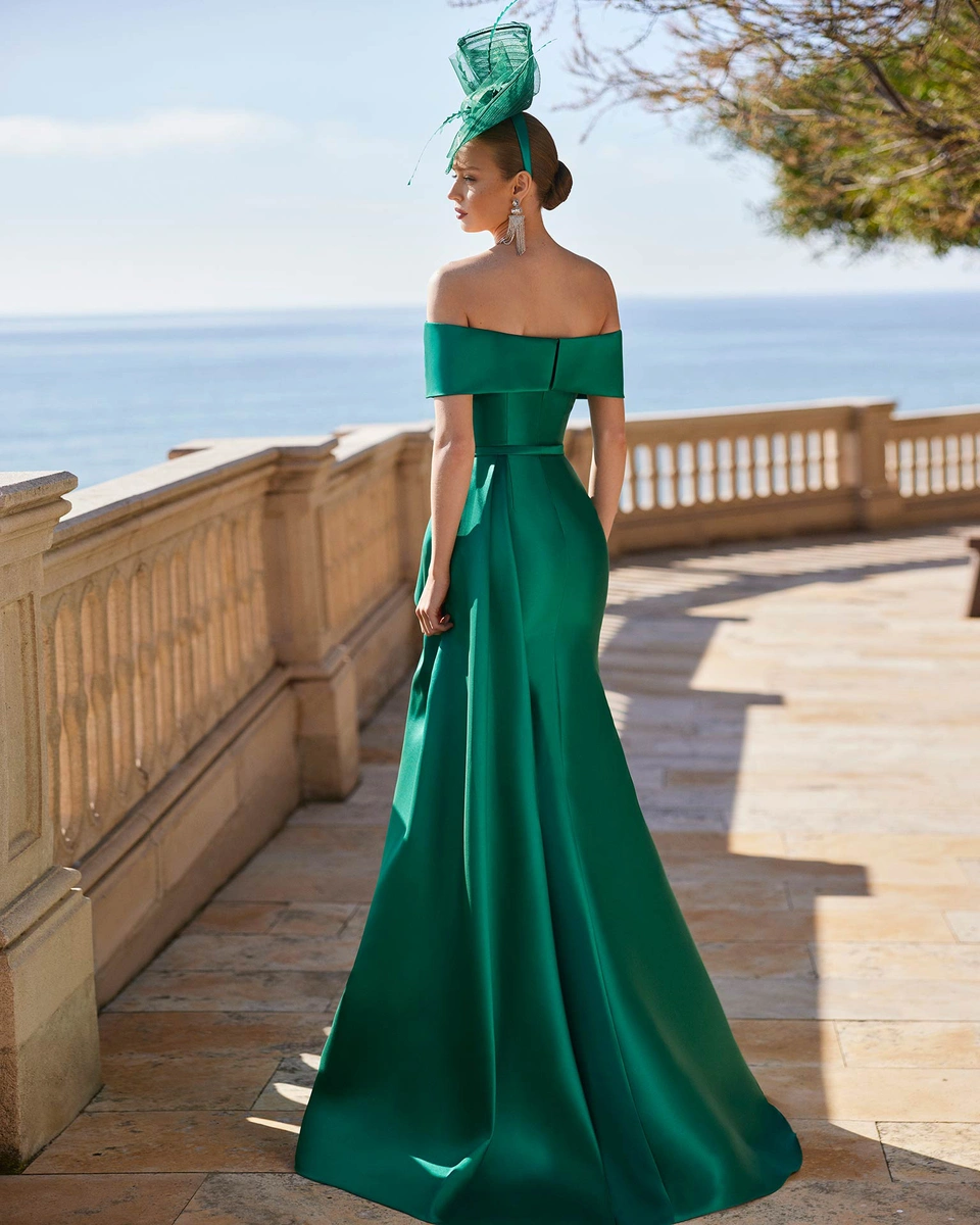Vestido de fiesta largo. Confeccionado en mikado. Con escote palabra de honor, espalda cerrada. Cuerpo con Flor de adorno y abertura delantera. Conjunto Couture Club.