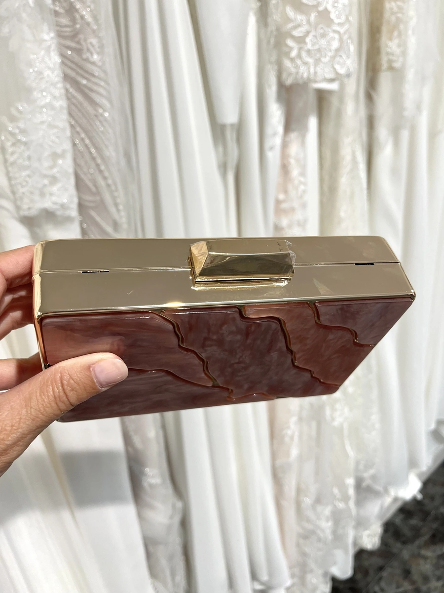Bolso de nácar y metal en dorado. El mismo bolso lleva una cadena por si se quiere llevar colgado. Tiene el tamaño ideal para poder llevar un smartphone o maquillaje.