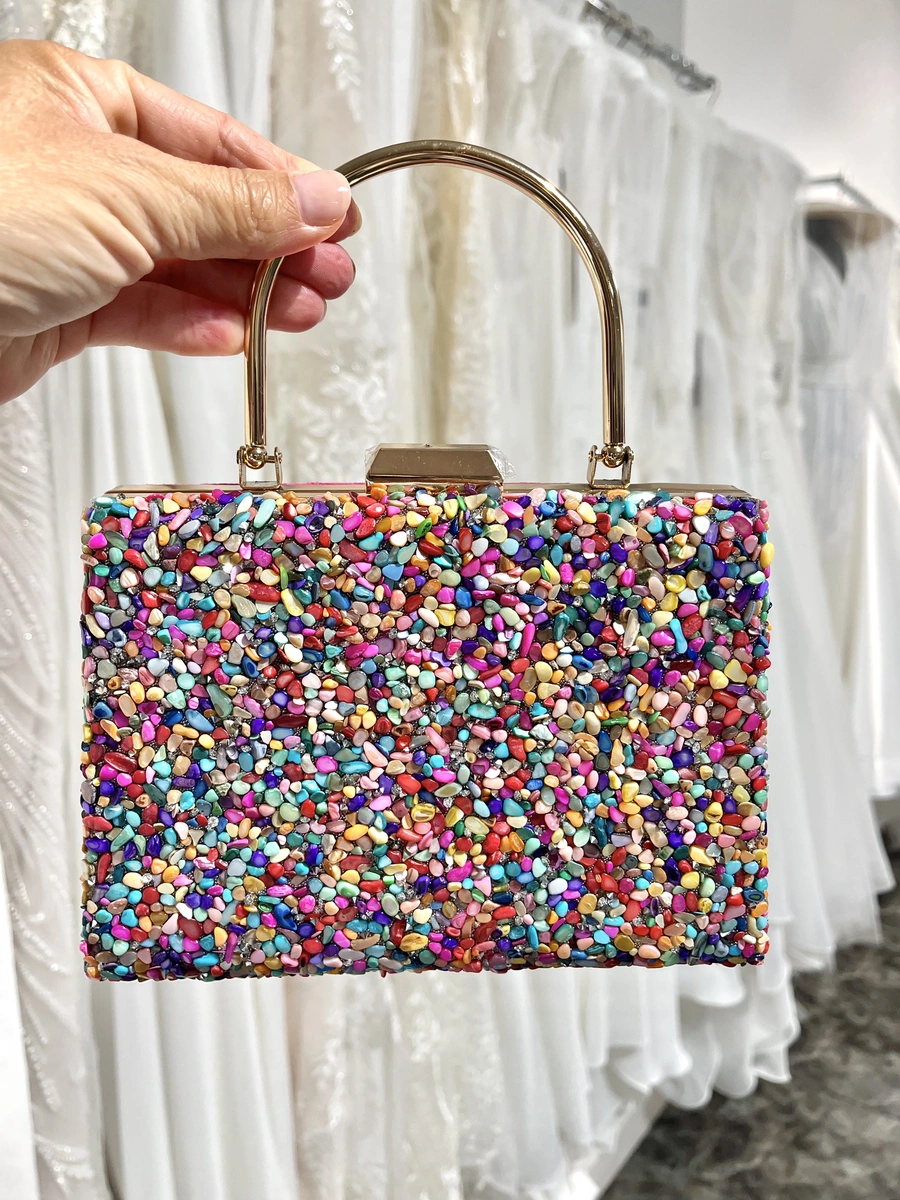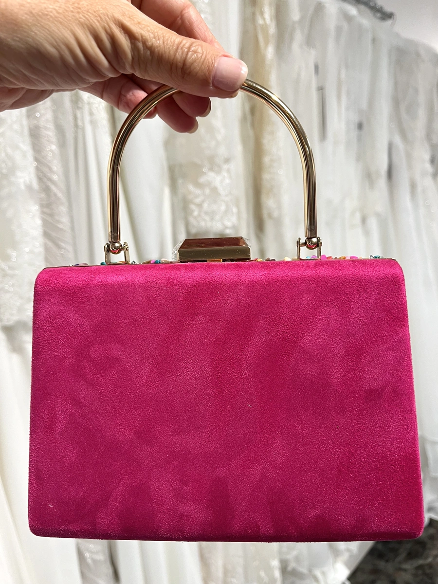 Bolso de fiesta realizado por un lado con pedrería multicolor y por el otro lado es liso en color fucsia. Lleva un asa metalizada y además también una pequeña cadena por si se quiere llevar colgado al hombro. Es un bolso ideal porque puedes llevar de todo dentro (cabe un smartphone grande) y además combina con casi cualquier color de vestido.