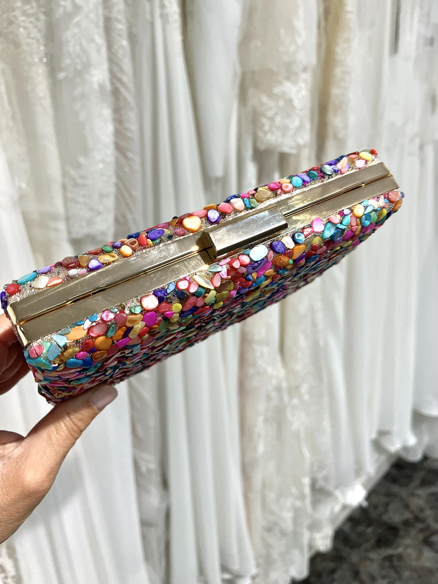 Bolso de fiesta, repleto de pedrería por ambas caras y cierre metalizado. Tiene una pequeña cadena en dorado por si se quiere llevar colgado de un hombro. Las medidas aproximadas del bolso son unos 17 cm de largo, 11 de alto y 4 cm de ancho, por lo que cabe perfectamente un smartphone y algo más dentro del bolso.