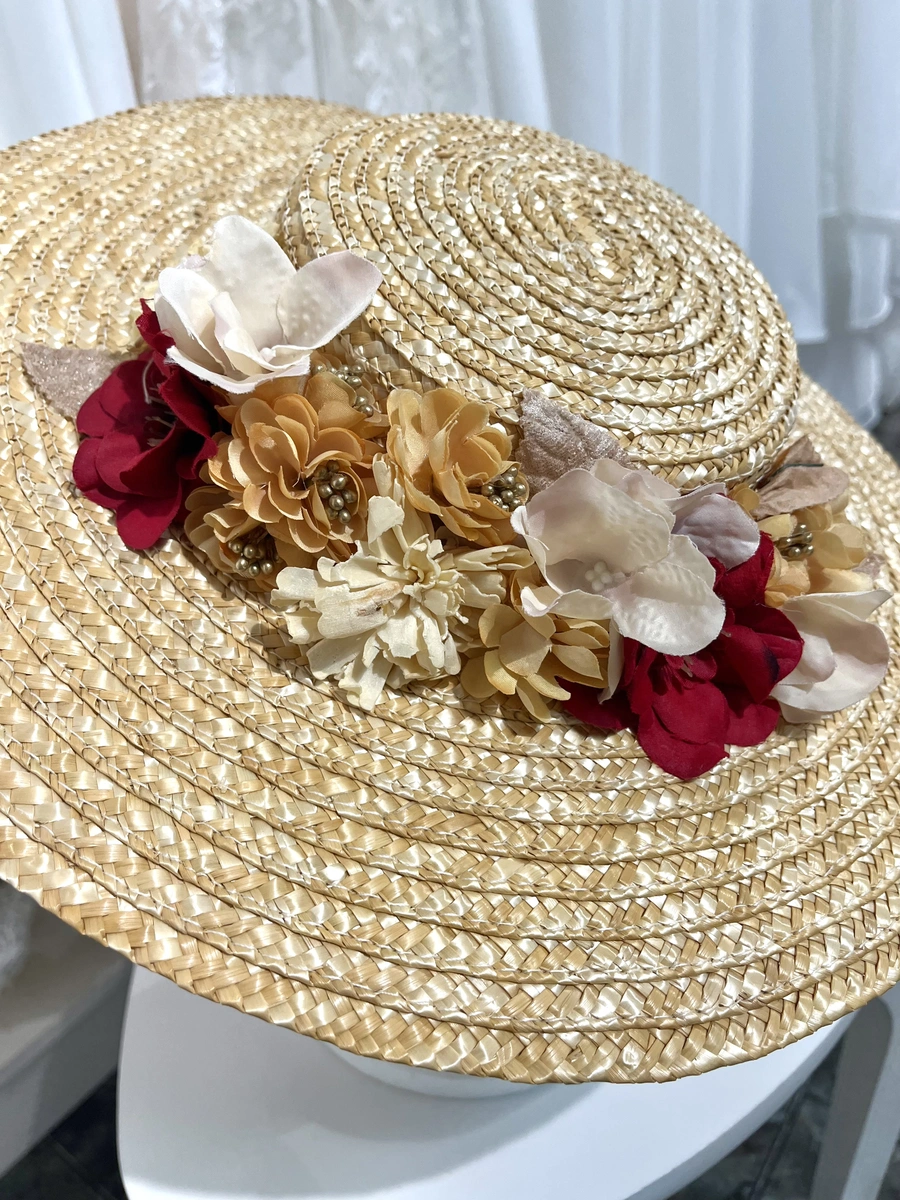 Pamela grande realizada en tejido de paja trenzada, con detalle de flores en burdeos y tonos crudo y tostado.
