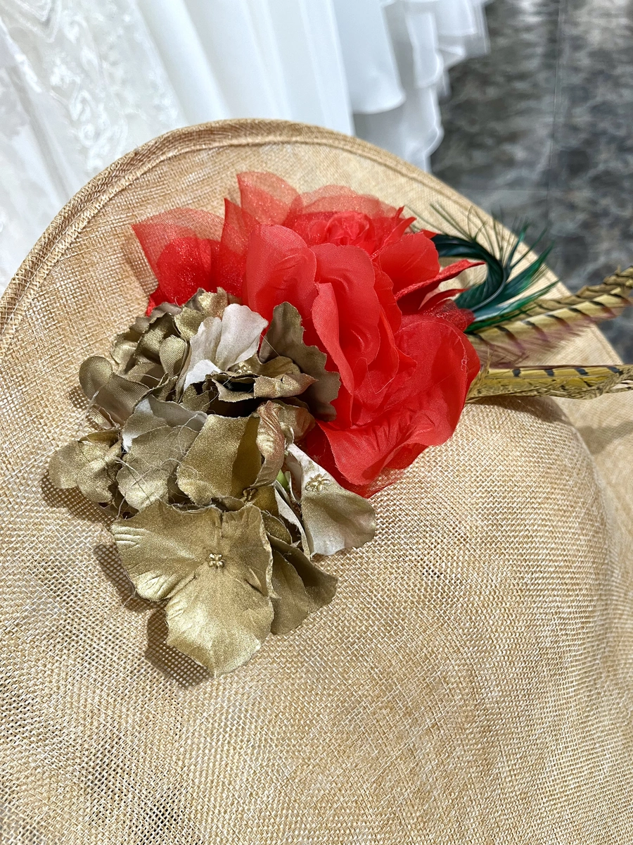 Pamela grande realizada en tejido tipo shimanay, en color tostado, con detalle de plumas y flores en tonos rojo y dorado