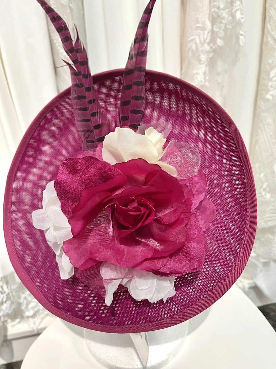 Pamela de fiesta realizada en shimanay de color buganvilla, con detalle de plumas flor en buganvilla y crudo.