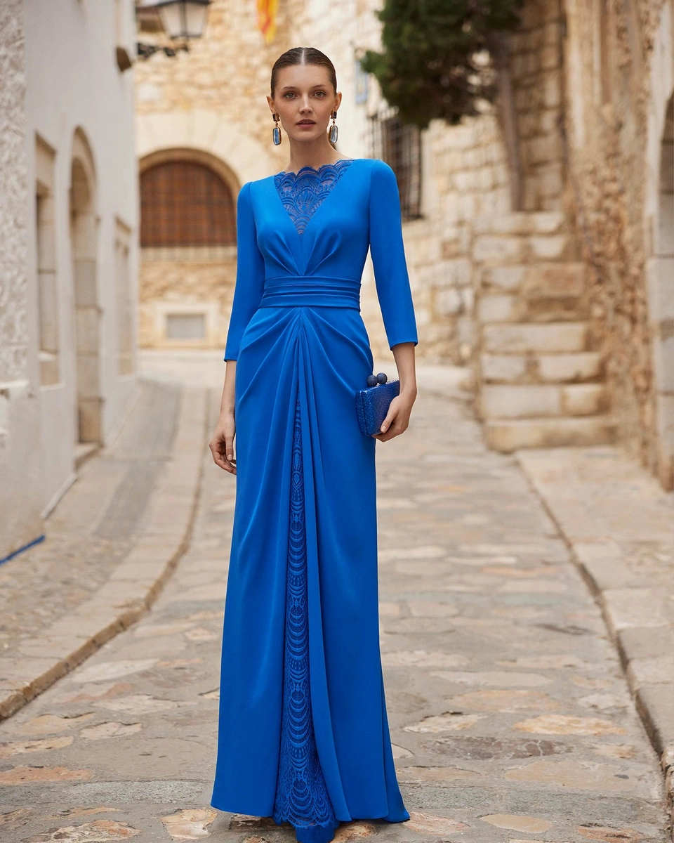 Vestido de fiesta largo. Confeccionado en crepé fino combinado con encaje y manga francesa.