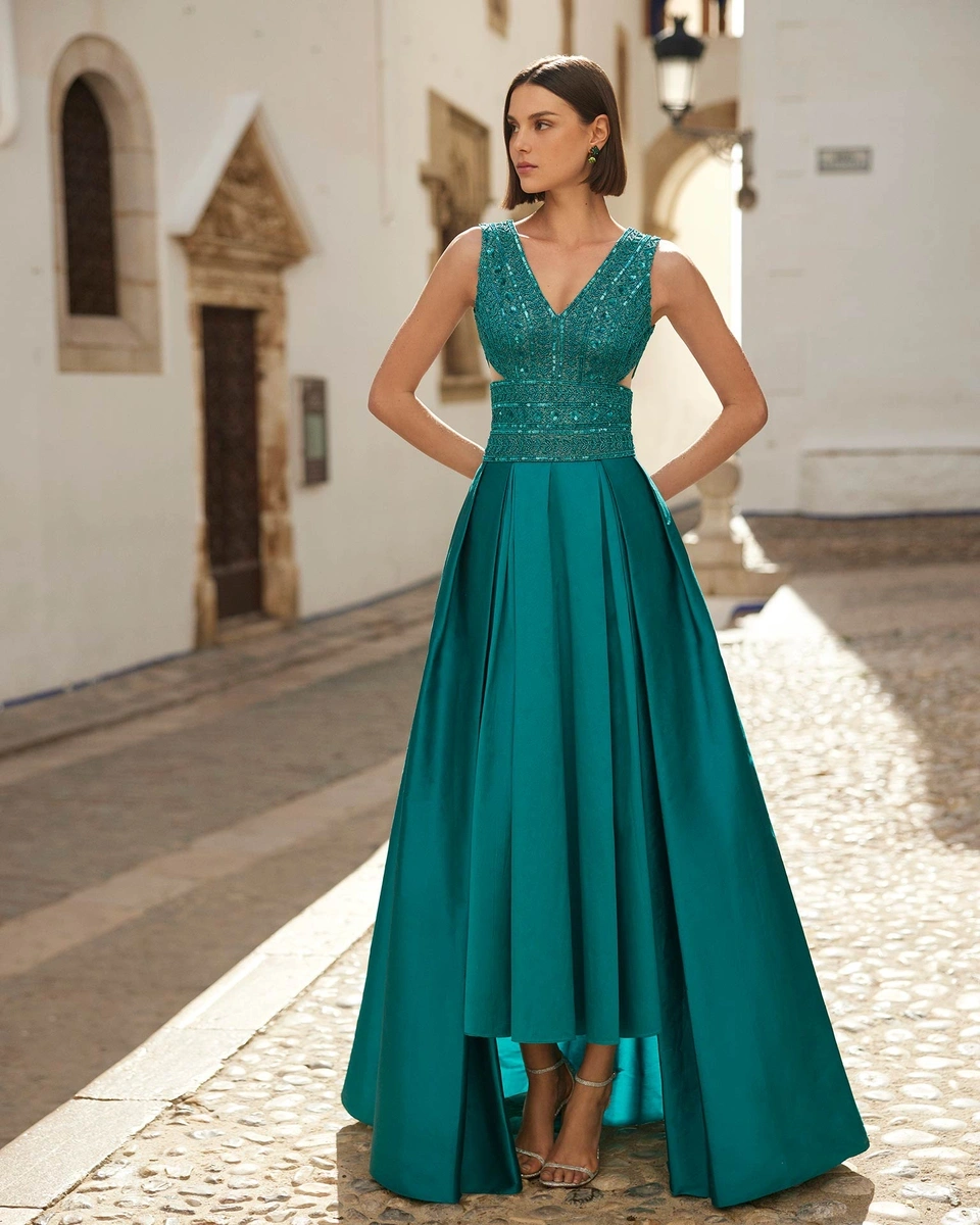 Vestido de fiesta midi y estilo clásico. Cuerpo en pedrería y falda en tafetán con sobrefalda. Con escote y espalda en v, tirantes. Look Aire Barcelona para fiestas y eventos.