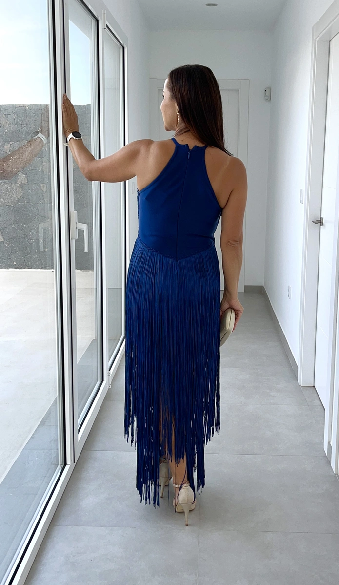 Vestido de fiesta, de estilo bandage, con detalle de flecos por todo el cuerpo. El vestido cierra en la espalda con una cremallera. Decir que los flecos son algo más gorditos de lo habitual, por lo que lo hace un vestido distinto y muy original.