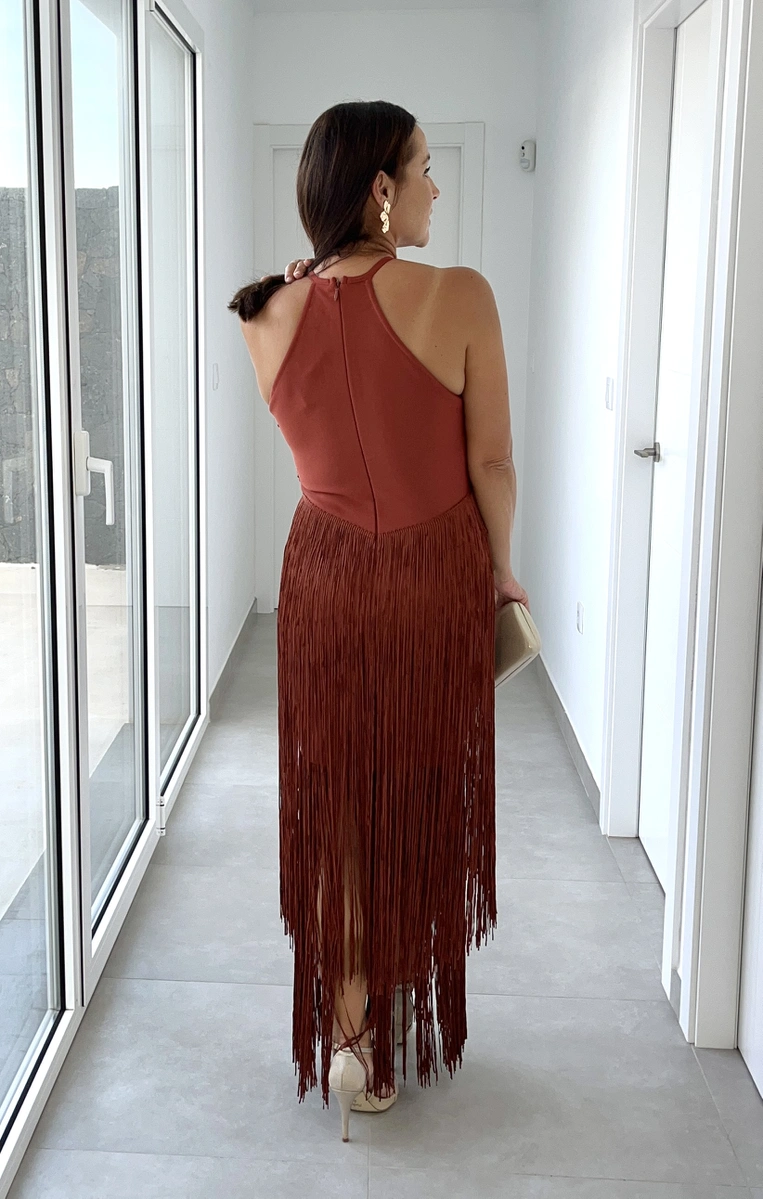 Vestido de fiesta, de estilo bandage, con detalle de flecos por todo el cuerpo. El vestido cierra en la espalda con una cremallera. Decir que los flecos son algo más gorditos de lo habitual, por lo que lo hace un vestido distinto y muy original.