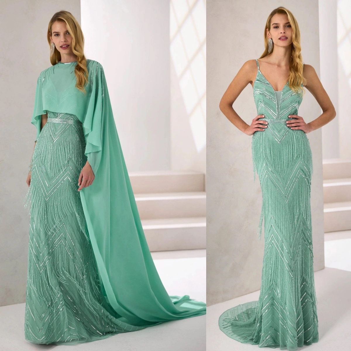 Vestido de fiesta largo. Confeccionado en pedrería. Escote pico, tirantes y espalda escotada. Incluye capa.