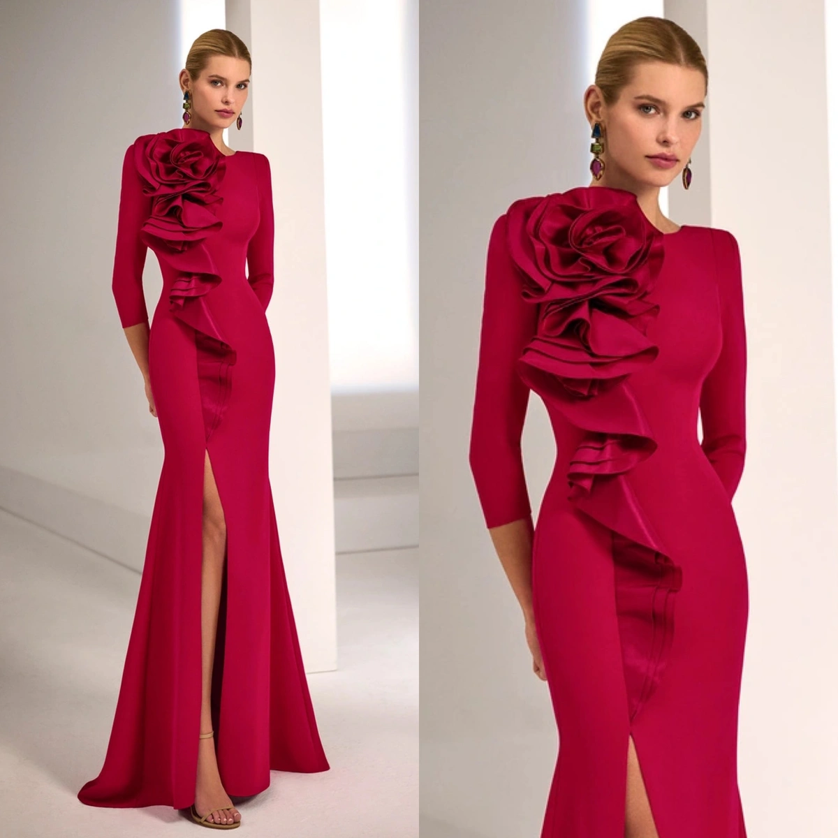 Vestido de fiesta largo. Confeccionado en crepé elástico. Escote barco. Manga francesa. Volantes en cuerpo.