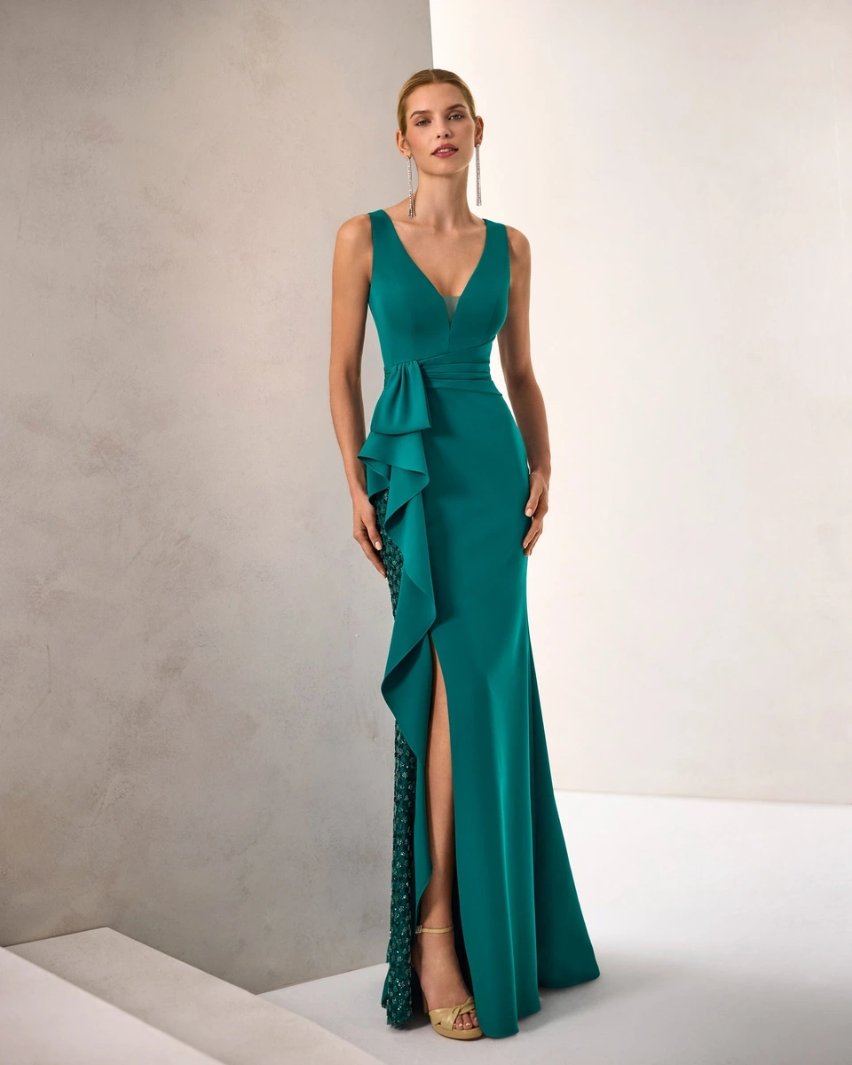 Vestido de fiesta largo, confeccionado en crepe y pedreria con escote en V, tirantes y espalda cerrada con chal.
