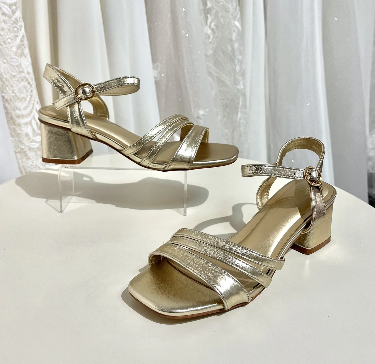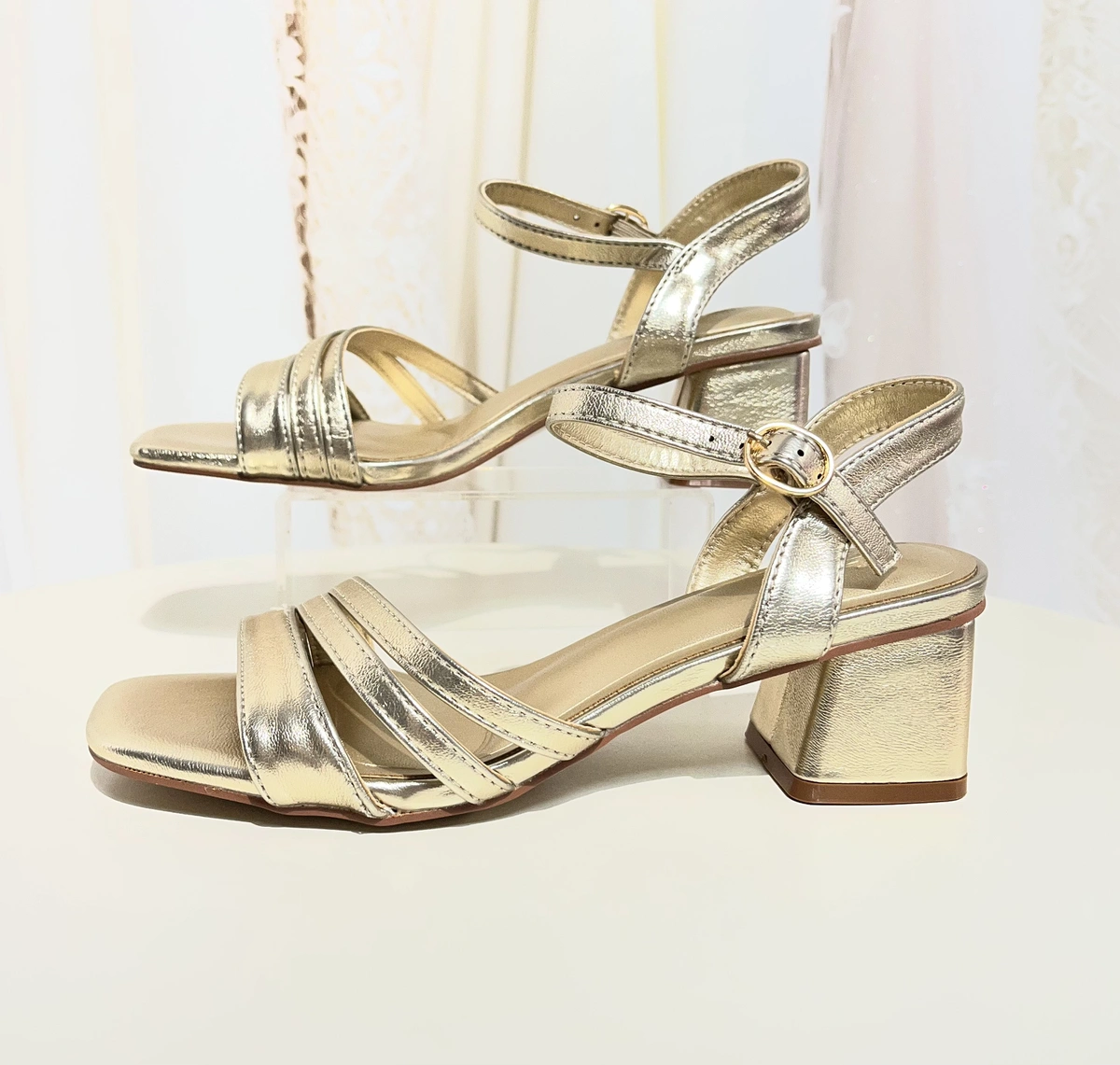 Sandalia de tacón cuadrado, pala de tiras en empeine y cierre de hebilla en tobillo.
