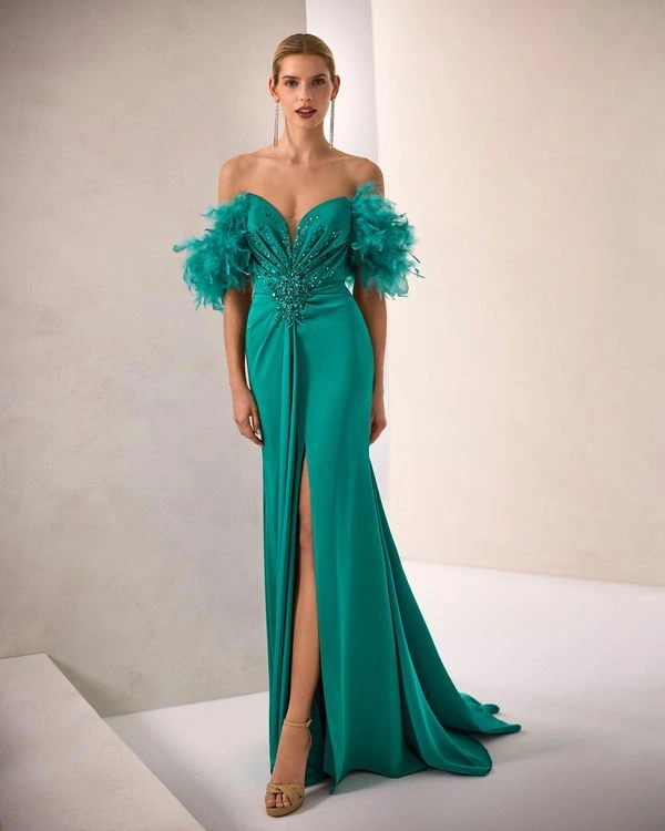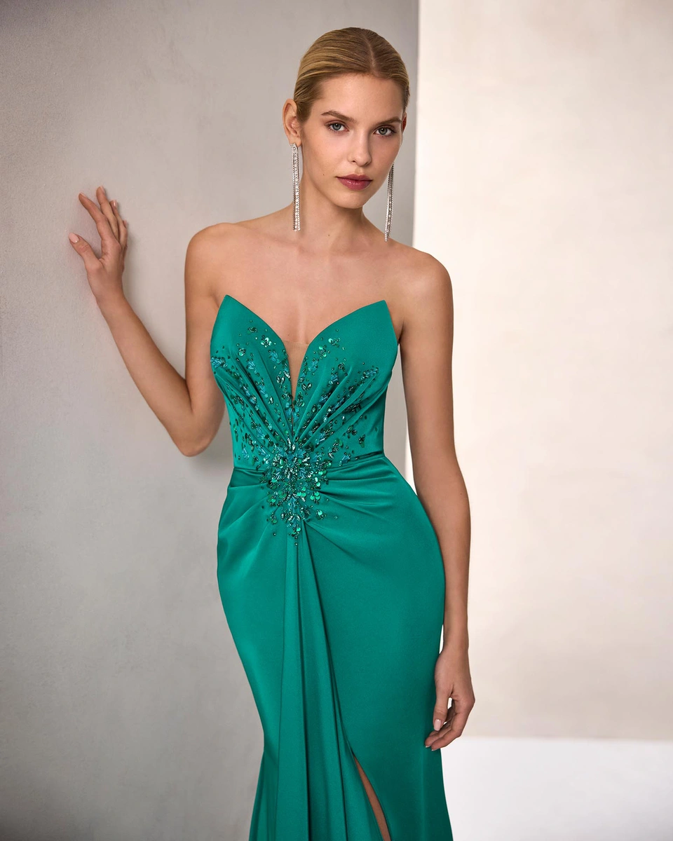 Vestido de fiesta largo. Confeccionado en crepé satén. Escote corazón y tirantes caídos. Detalles con pedrería. Incluye chal.