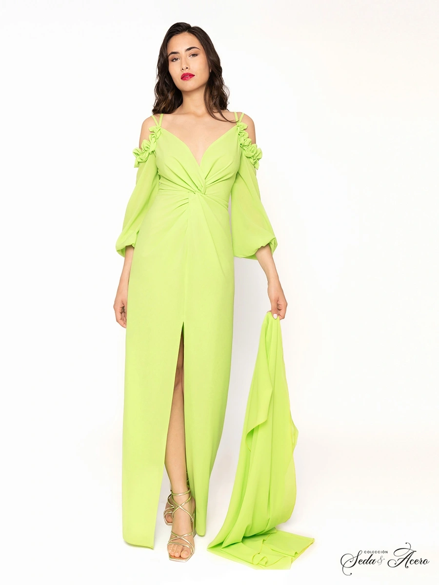 Un vestido precioso y muy original de la firma Moncho Heredia, realizado en gasa de color lima muy vivo, tiene detalle de tirantes y mangas caídas con flores. Sin duda es un modelo muy veraniego que puedes usar tanto en una boda de noche como de día.