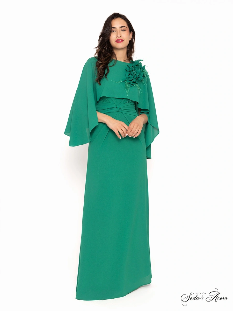 Vestido de la firma española Moncho Heredia. Un modelo super elegante, ideal para madrinas o invitadas muy cercanas a los novios. El vestido está realizado en crepe de color verde y lleva incluida una capa y un broche de flores, que se puede quitar y poner donde la cliente más lo desee.