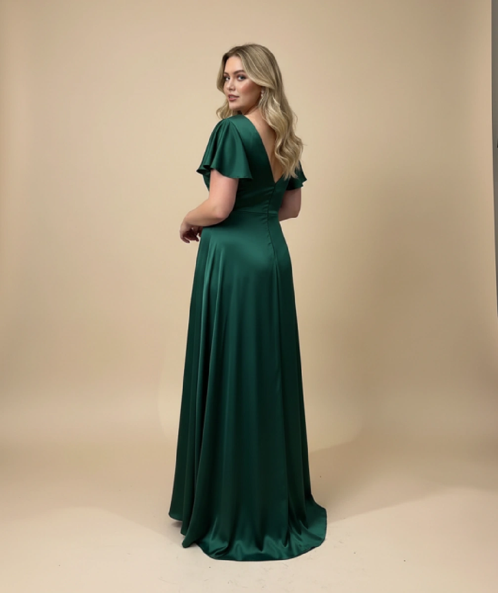 Un vestido precioso, diseñado para invitada curvy. El vestido está realizado en raso, con escote y espalda en pico. También tiene abertura en la falda.