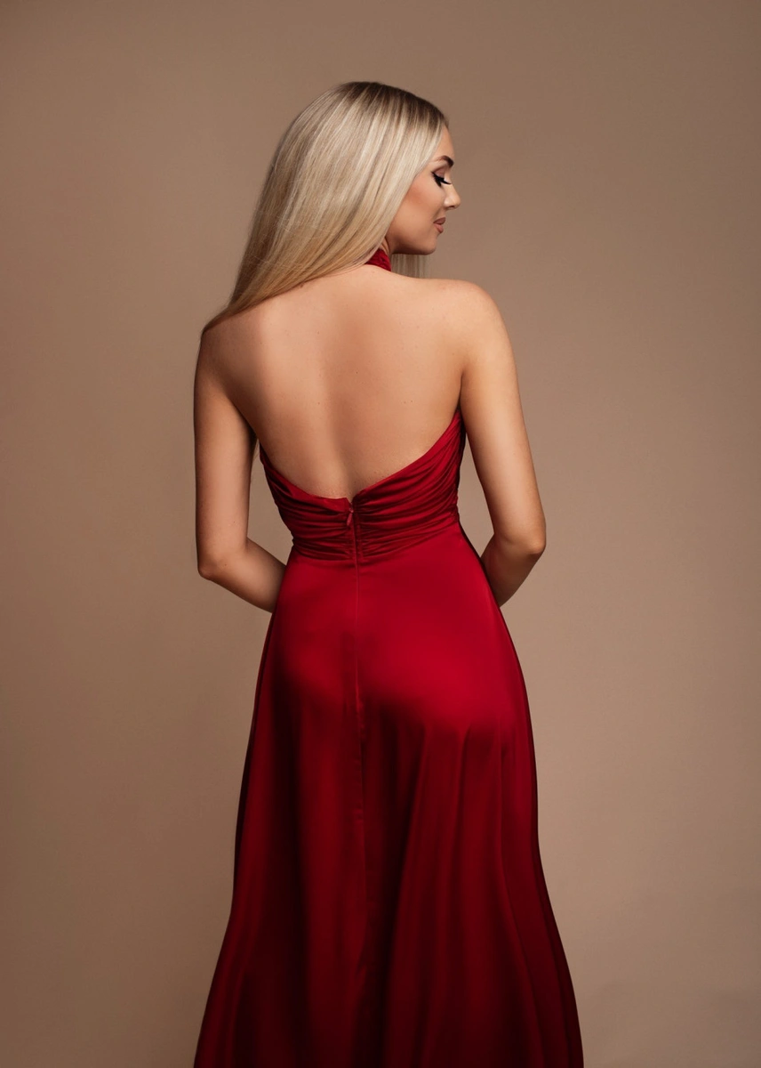Un vestido largo espectacular, confeccionado en raso y cuello halter. Un vestido que sin duda sería ideal para una invitada de noche, dama de honor u orla. El vestido, a pesar de ser escotado, lleva copas, por lo que se puede llevar perfectamente sin sujetador.