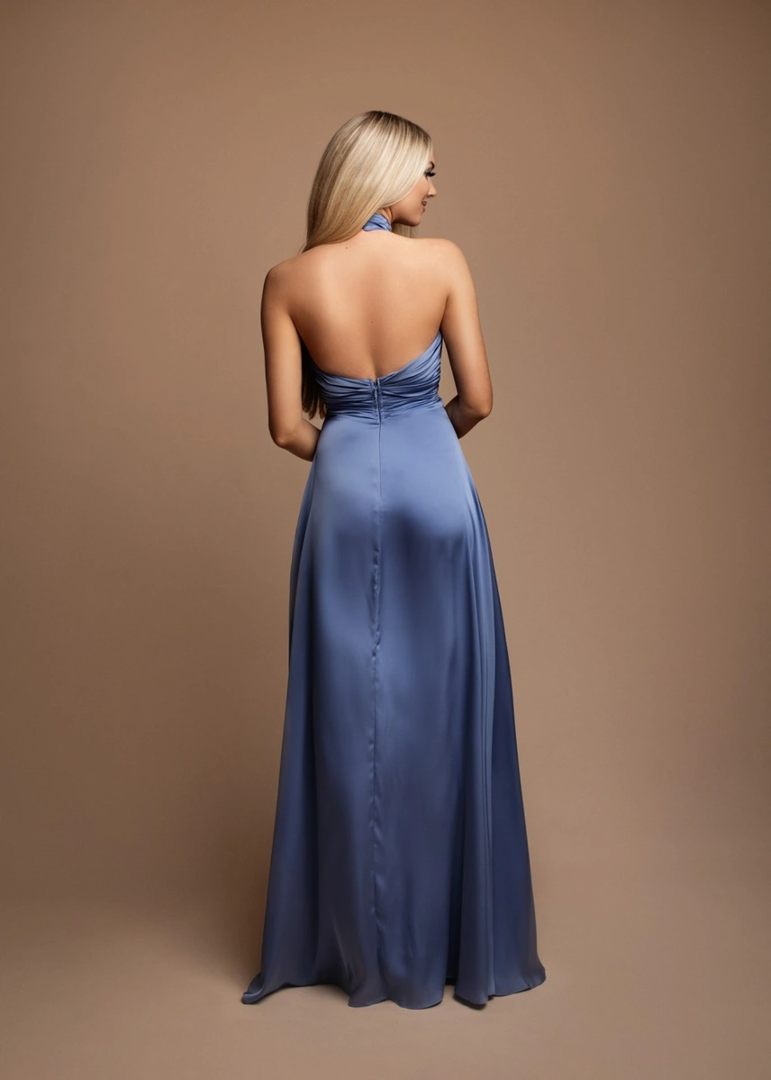 Un vestido largo espectacular, confeccionado en raso y cuello halter. Un vestido que sin duda sería ideal para una invitada de noche, dama de honor u orla. El vestido, a pesar de ser escotado, lleva copas, por lo que se puede llevar perfectamente sin sujetador.