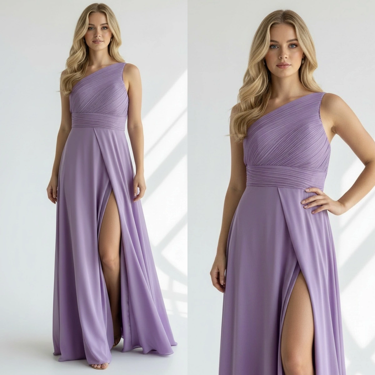 El escote es asimétrico y drapeado. La espalda es elástica para que se puede adaptar al mayor rango de tallas.
