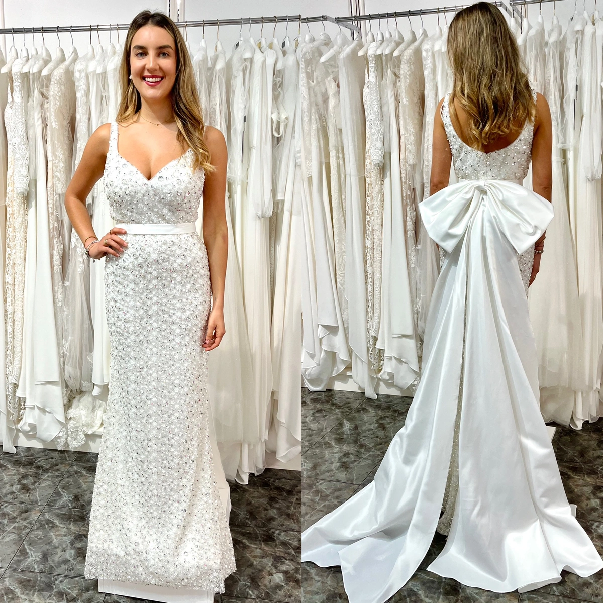Vestido de fiesta largo. Confeccionado en lentejuelas. Escote corazón con tirantes. Lazo de raso. Incluye chal.