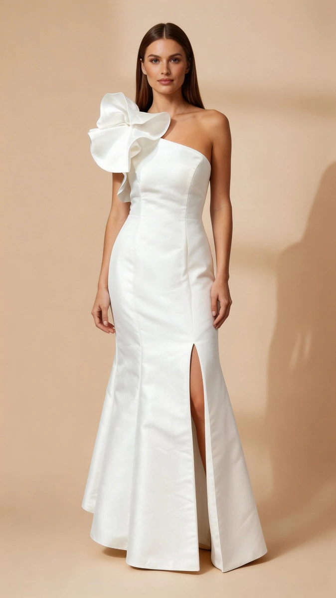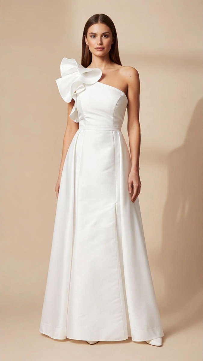 Vestido Marfil Barcelona confeccionado en tejido mikado. Escote asimétrico con volante en el hombro un volumen que te hará lucir diferente y elegante. Falda de sirena con abertura lateral. Sobrefalda desmontable. Un vestido ideal para novias que buscan un modelo sencillo y atemporal.