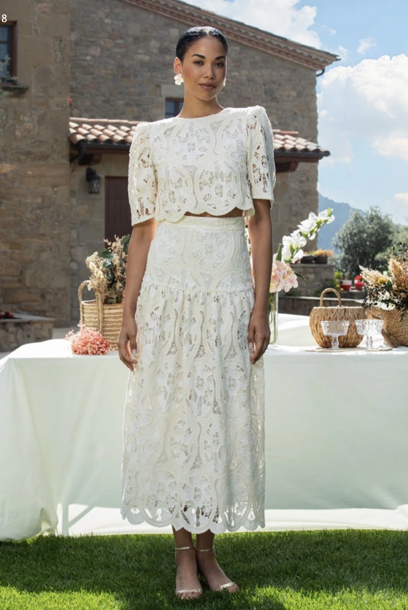 Un conjunto de top y falda de la firma española Betzzia. Realizada en tejido de encaje totalmente bordado. Sin duda un conjunto muy bonito y original que vale tanto para una mamá de comunión como para un bautizo.