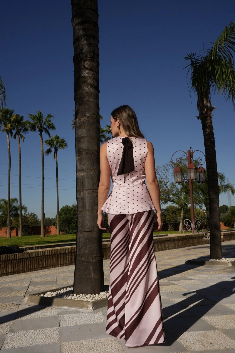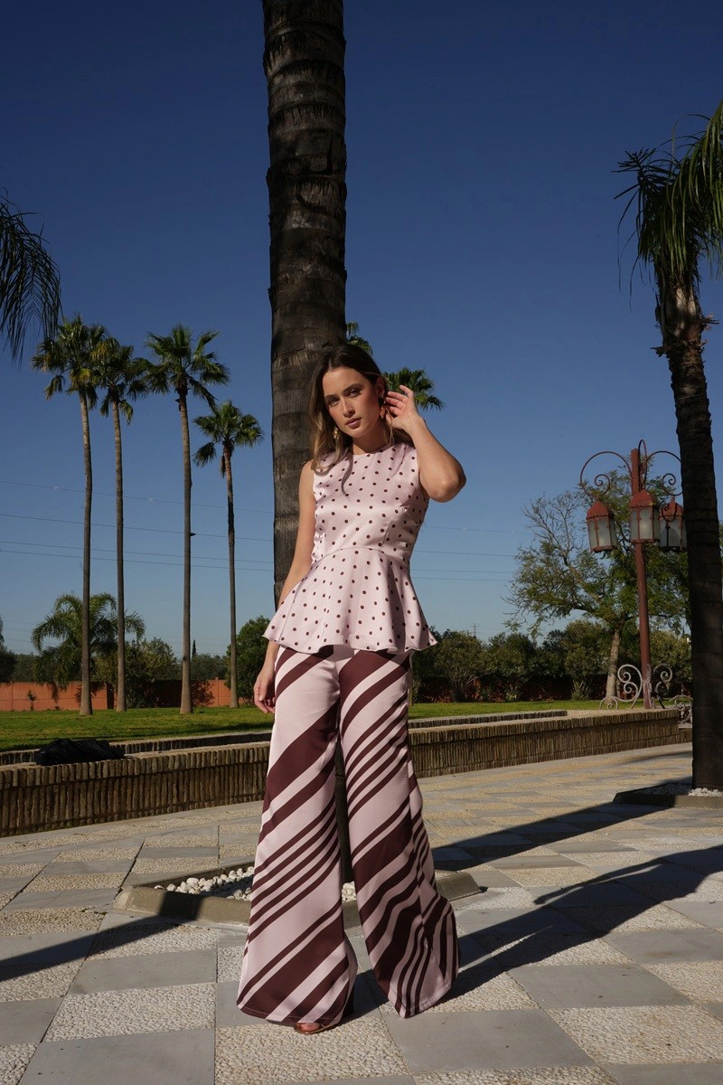 Conjunto de top y pantalón. Pantalón de corte ancho y talle alto para mujer, con cierre de cremallera lateral. Confeccionado en un elegante tejido de raso con estampado de rayas, este pantalón de vestir destaca por su caída fluida y su acabado satinado. Si buscas un pantalón para invitada versátil y especial, es la elección perfecta para graduaciones, celebraciones, bautizos, comuniones y eventos. Su silueta estiliza la figura y alarga visualmente las piernas, mientras que el talle alto define la cintura y ofrece un ajuste favorecedor. Ideal para combinar con nuestra blusa Jane de lunares con bajo de volante o con tops delicados, creando looks elegantes y femeninos tanto para un día de feria como para una celebración especial.
