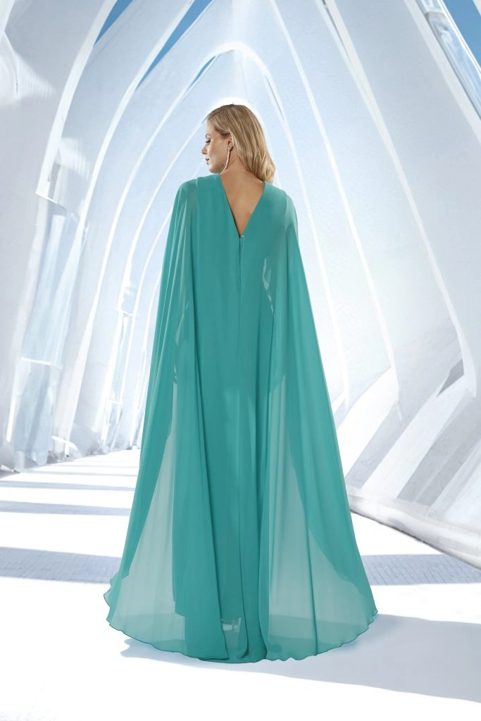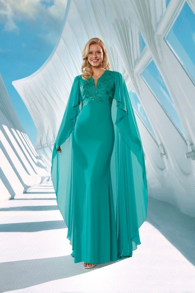Vestido largo en tono turquesa con elegante caída y diseño fluido. Destaca por su cuerpo entallado con bordados y aplicaciones brillantes en el pecho, que realzan el escote en pico. Las mangas de gasa con efecto capa aportan movimiento, ligereza y un toque de distinción. Ideal para invitadas que buscan un look sofisticado, favorecedor y con presencia en eventos o celebraciones especiales.