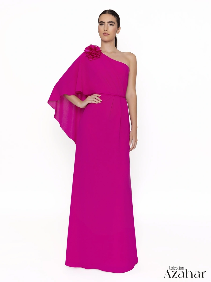 Vestido largo de fiesta de la firma española Casting, realizado en crepe de color fucsia, tiene un bonito detalle a modo de capa, lo cual hace que el vestido quede muy elegante. Lleva un pequeño broche en forma de flor que la cliente puede llevar en cualquier lugar, desde el hombro hasta la zona de la cintura.