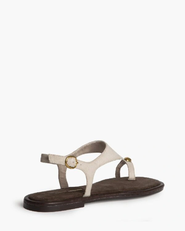 Sandalia plana, con detalle de anillo. Cierre mediante hebillas en el lateral exterior.
