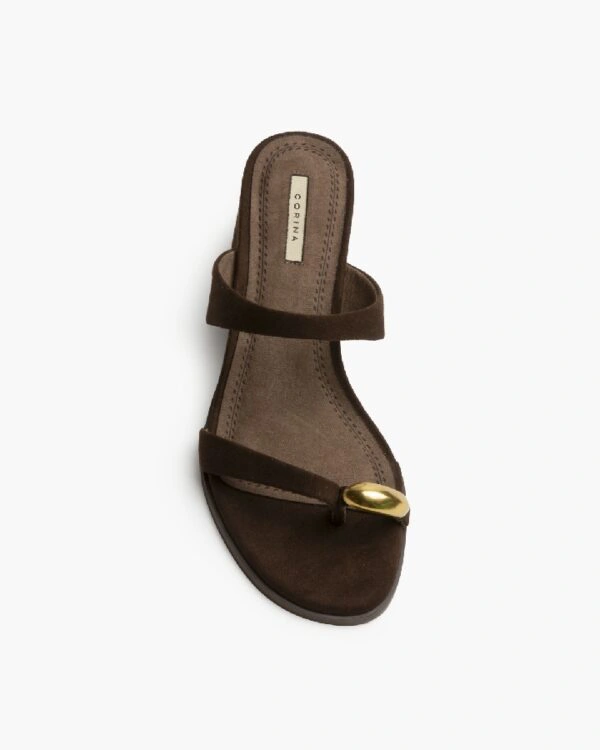 Sandalia de tacón bajo. Detalle de anillo en el dedo pulgar. Tacón ancho y acabado en punta redonda.