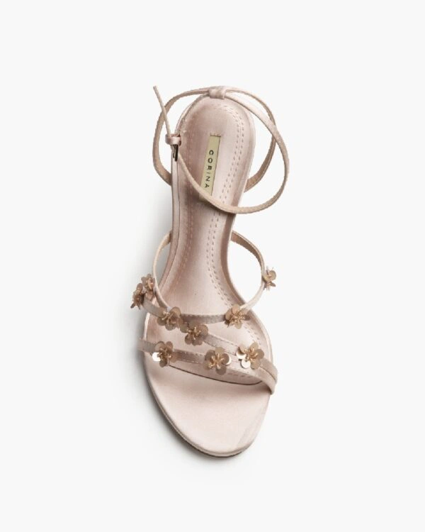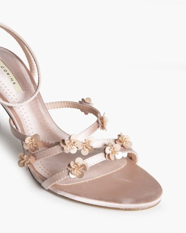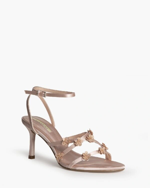 Sandalia de tacón alto. Adorno de flores en las tiras delanteras. Cierre mediante hebilla en la pulsera del tobillo. Acabado en punta redonda.