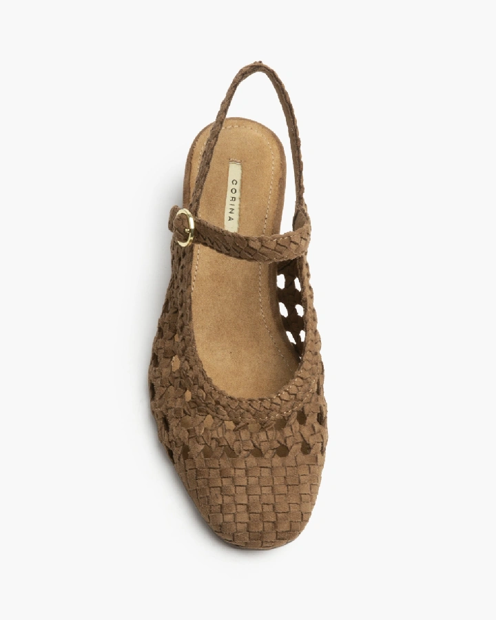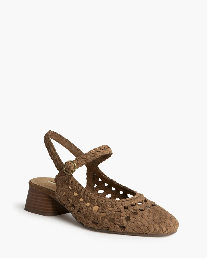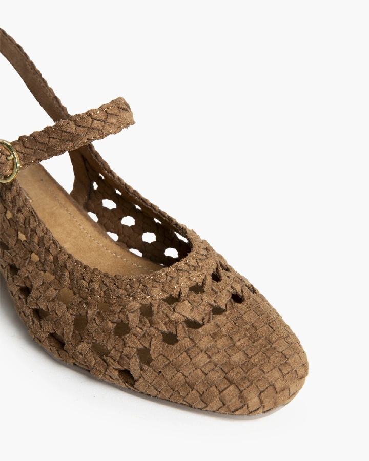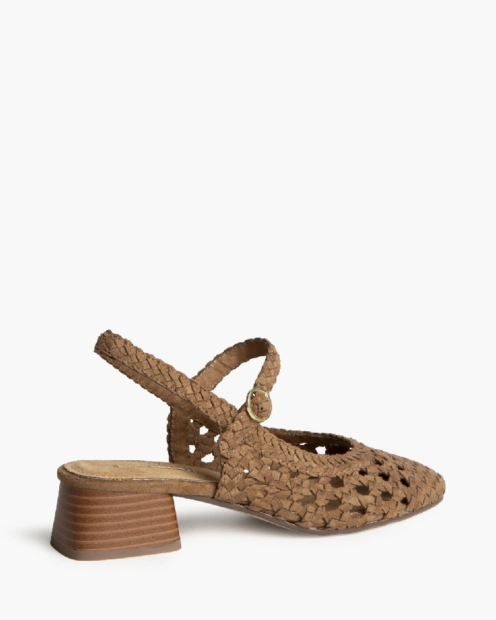 Sandalia de tacón bajo. Corte trenzado. Tacón ancho y acabado en punta redonda. Hebilla en el empeine.