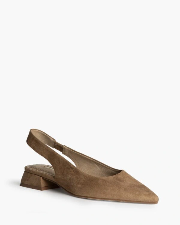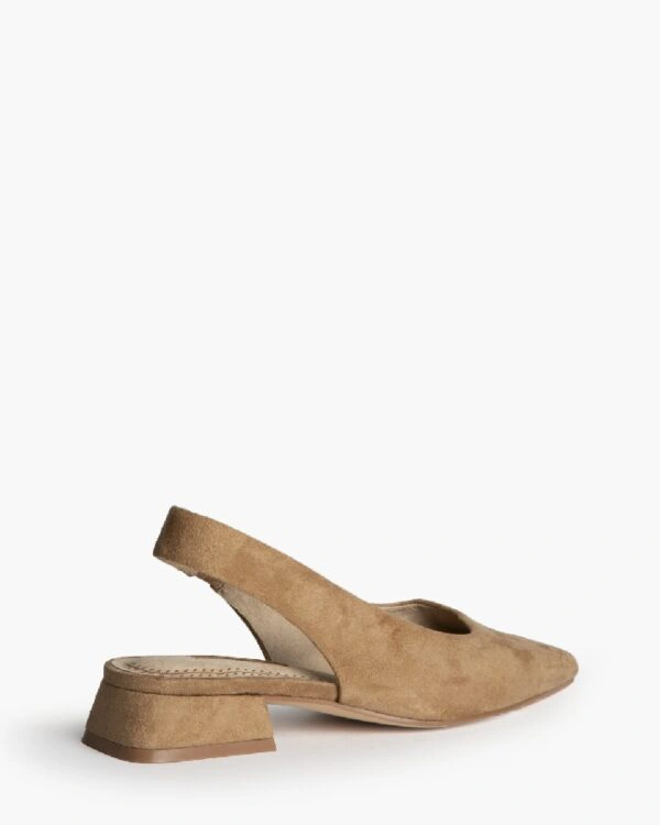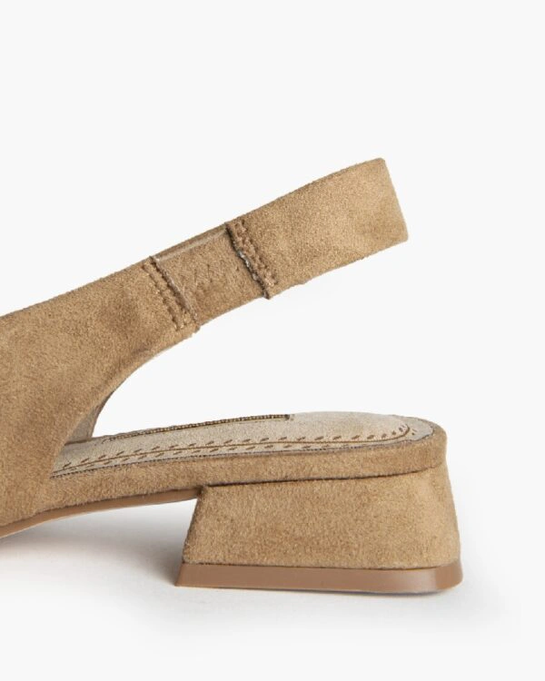 Sandalia de tacón bajo. Acabado en punta. Elástico en el lateral inte-rior. Tacón cuadrado.