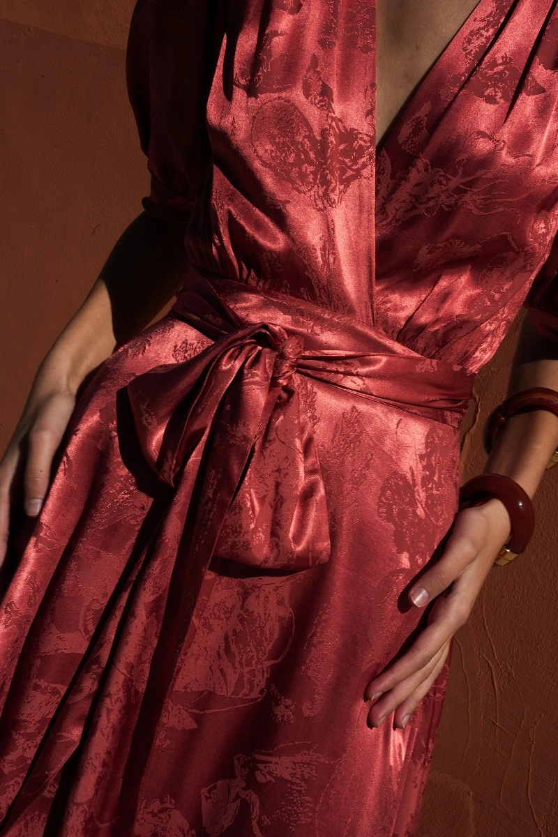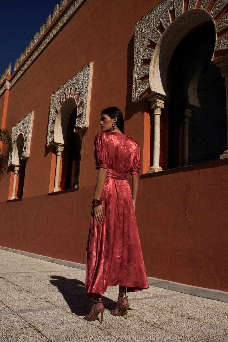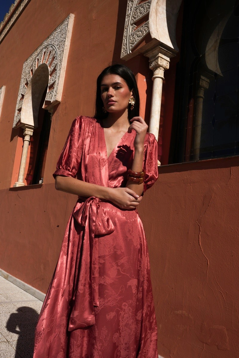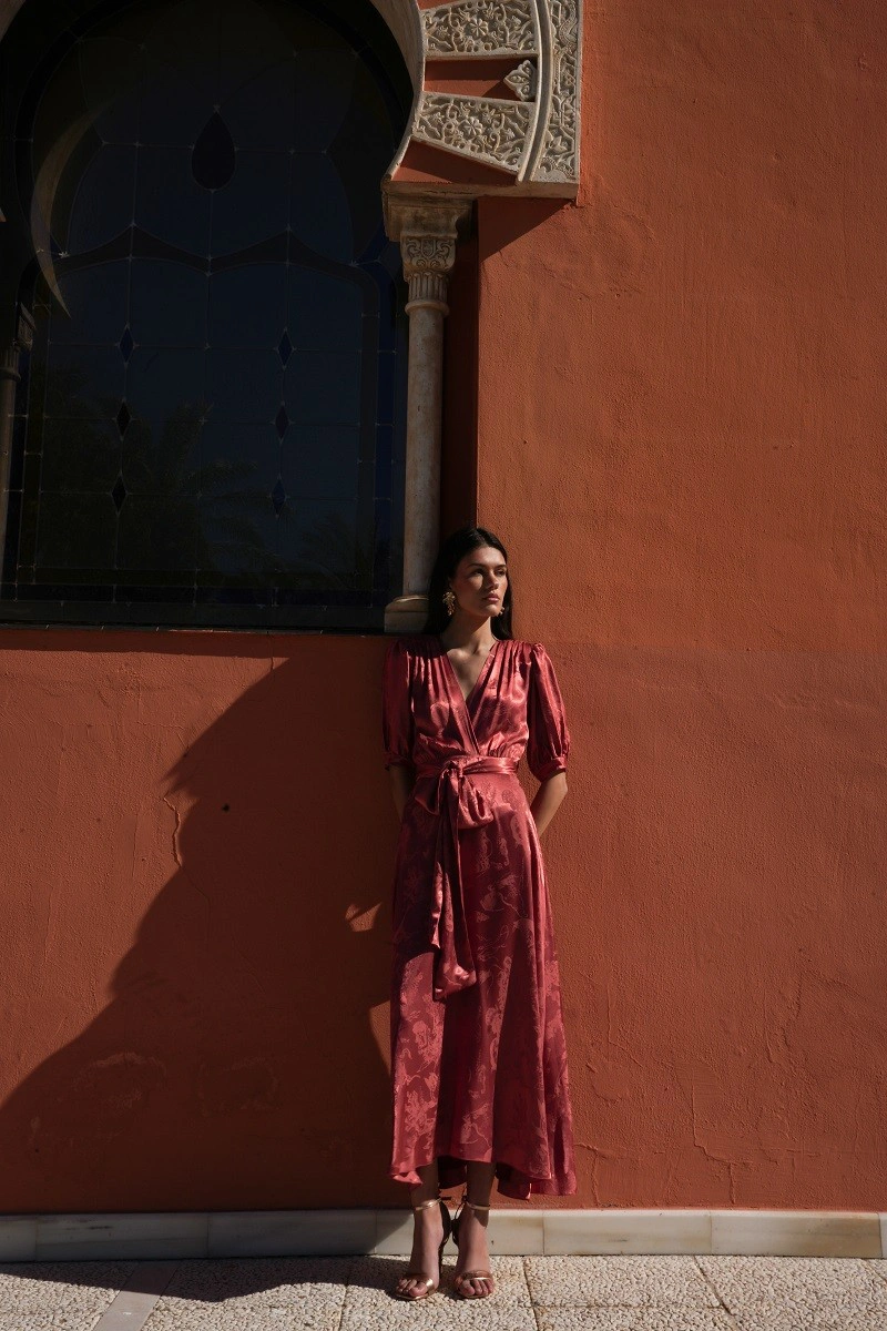 El vestido Luz en color teja destaca por su elegante tejido jacquard y su favorecedor diseño cruzado, que realza la silueta con un ajuste femenino. Confeccionado en viscosa, aporta una caída fluida y agradable al tacto. Incorpora hombreras que estructuran la figura y forro interior para mayor comodidad y un acabado impecable. Ideal para invitadas de boda de día o de noche, este vestido de mujer es perfecto para lucir un look sofisticado en celebraciones y ocasiones especiales.