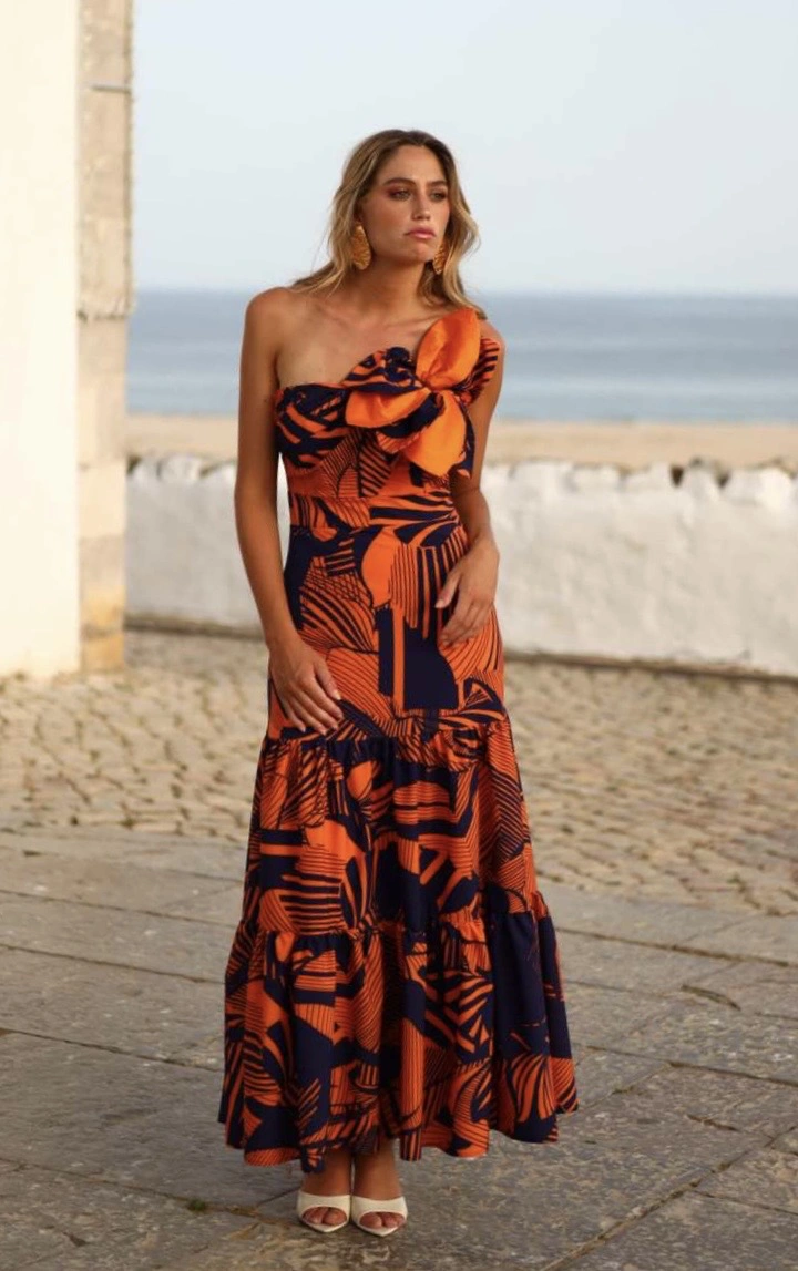 Vestido de fiesta de la firma española Magnolia Kobus. Realizado en tejido estampado de inspiración étnica.
