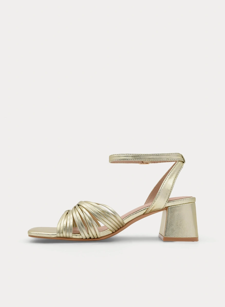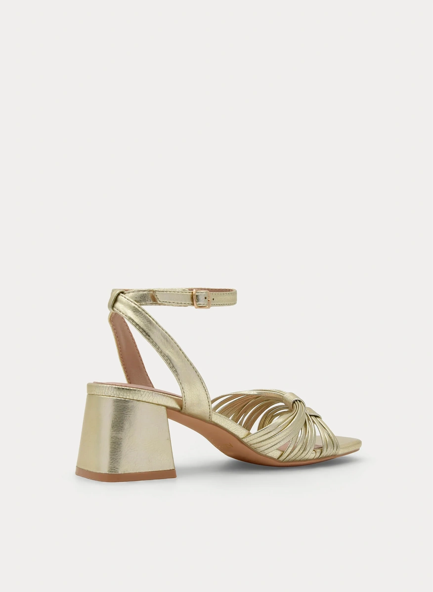 Sandalia dorada con pala cruzada fruncida en el empeine, tacón medio ancho y base cuadrada. Pulsera al tobillo con hebilla metálica y plantilla acolchada. Un modelo cómodo con acabado metalizado.