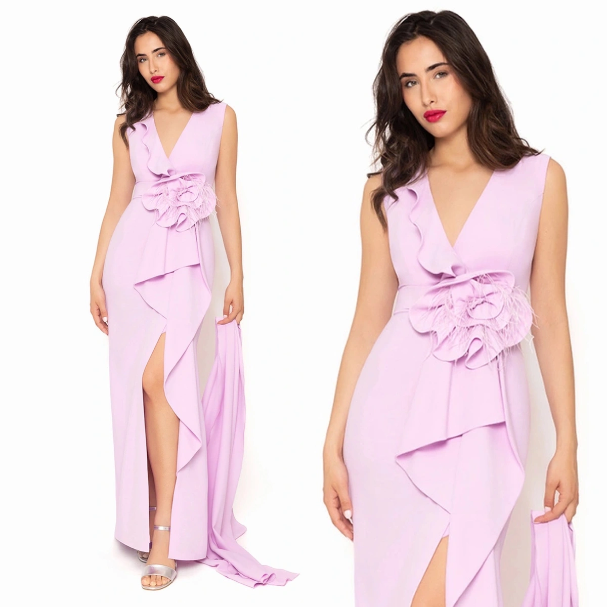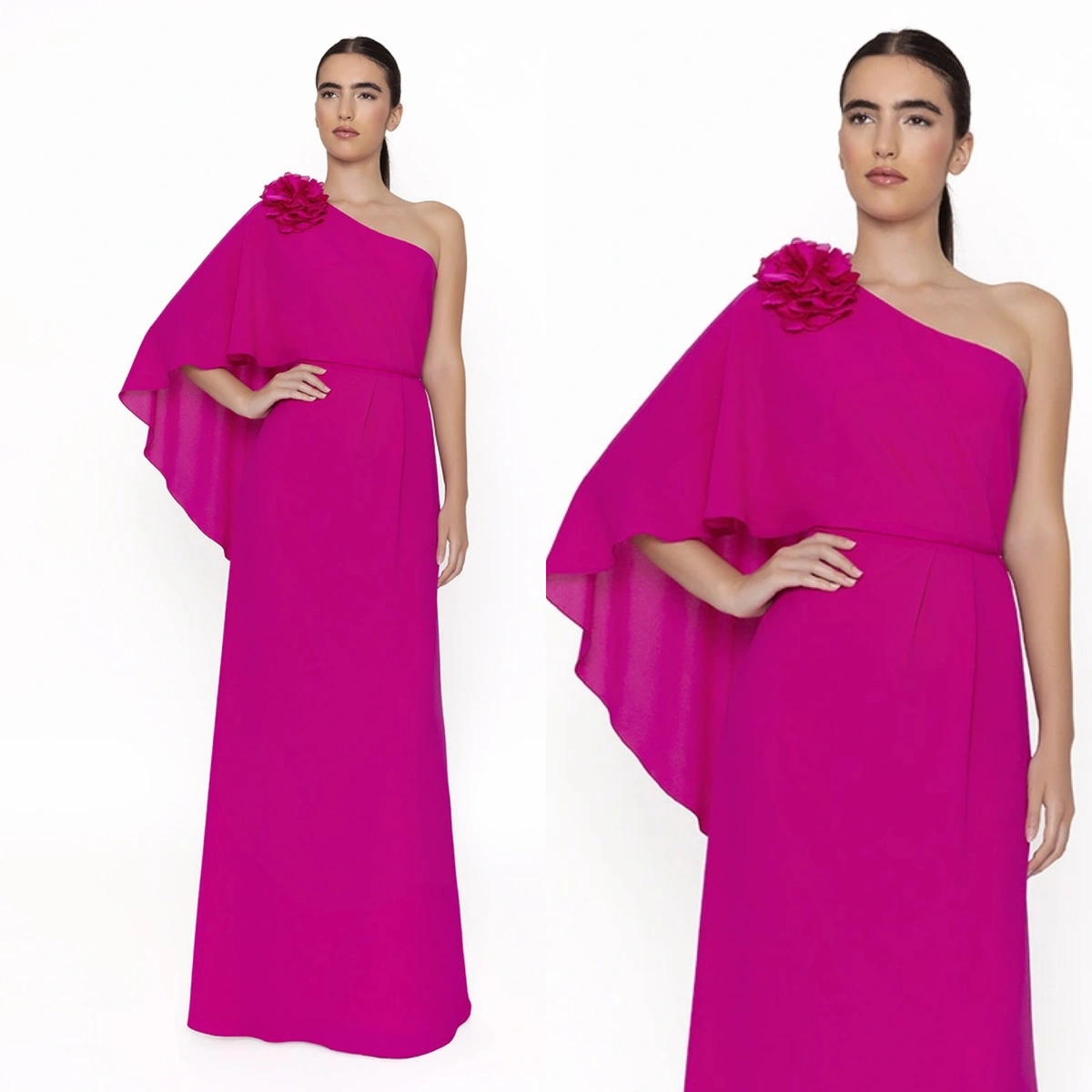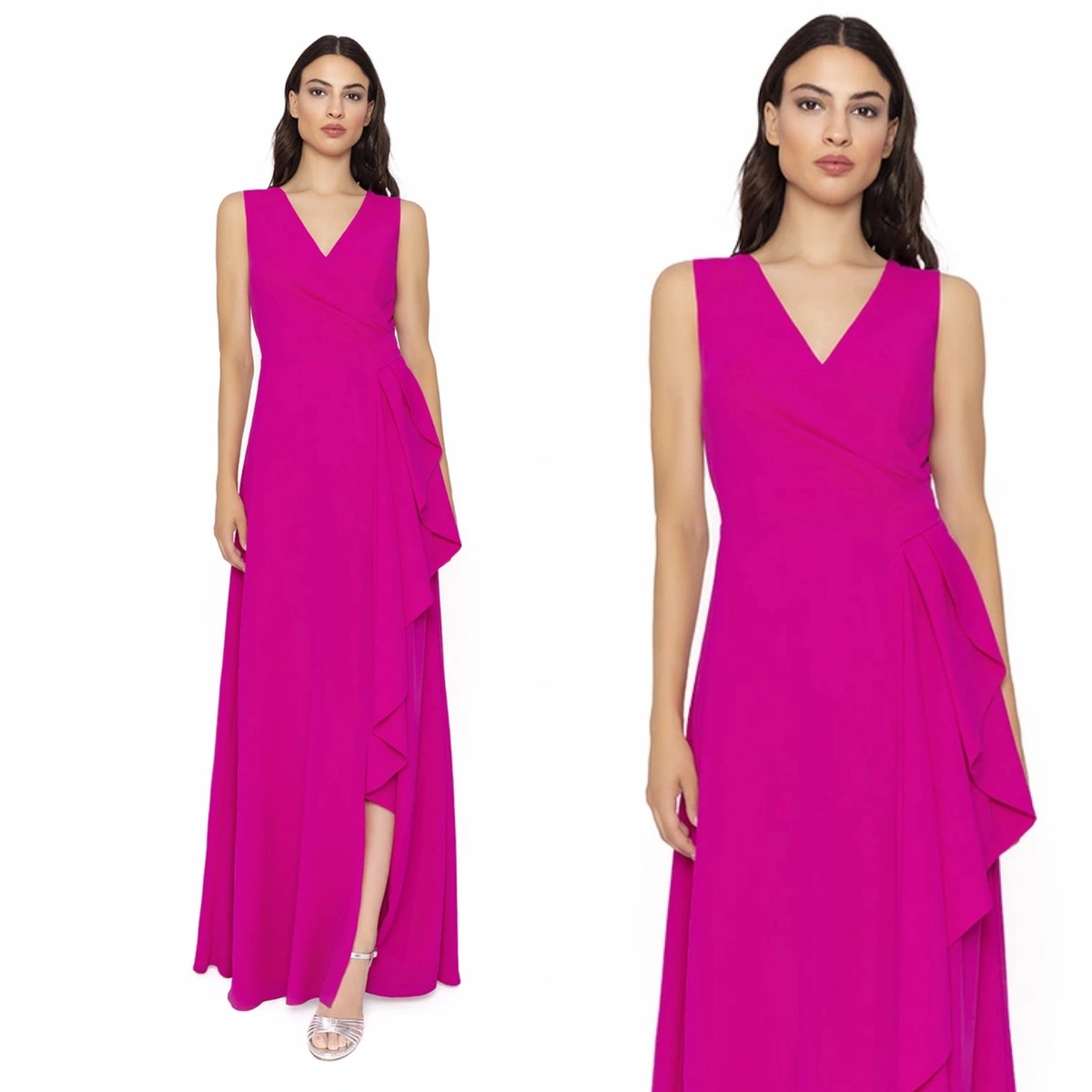 Vestido largo en tono buganvilla con elegante caída y diseño fluido. ...